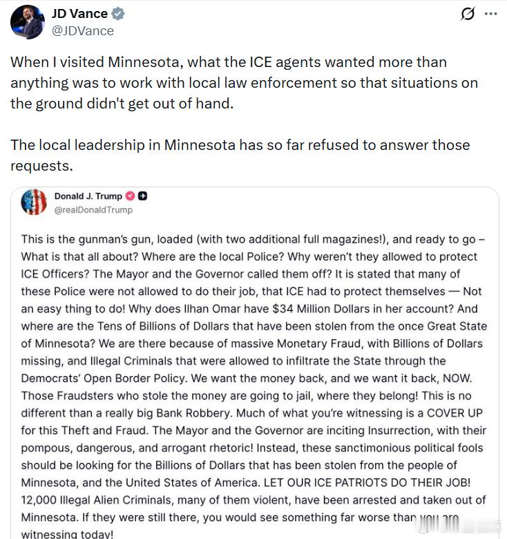 副总统万斯:“当我访问明尼苏达时,ICE的探员最想要的,就是能够与当地执法部门合作,这样现场的局势就不会失控。而明尼苏达的地方岭导层迄今为止拒绝回应这些请求。”