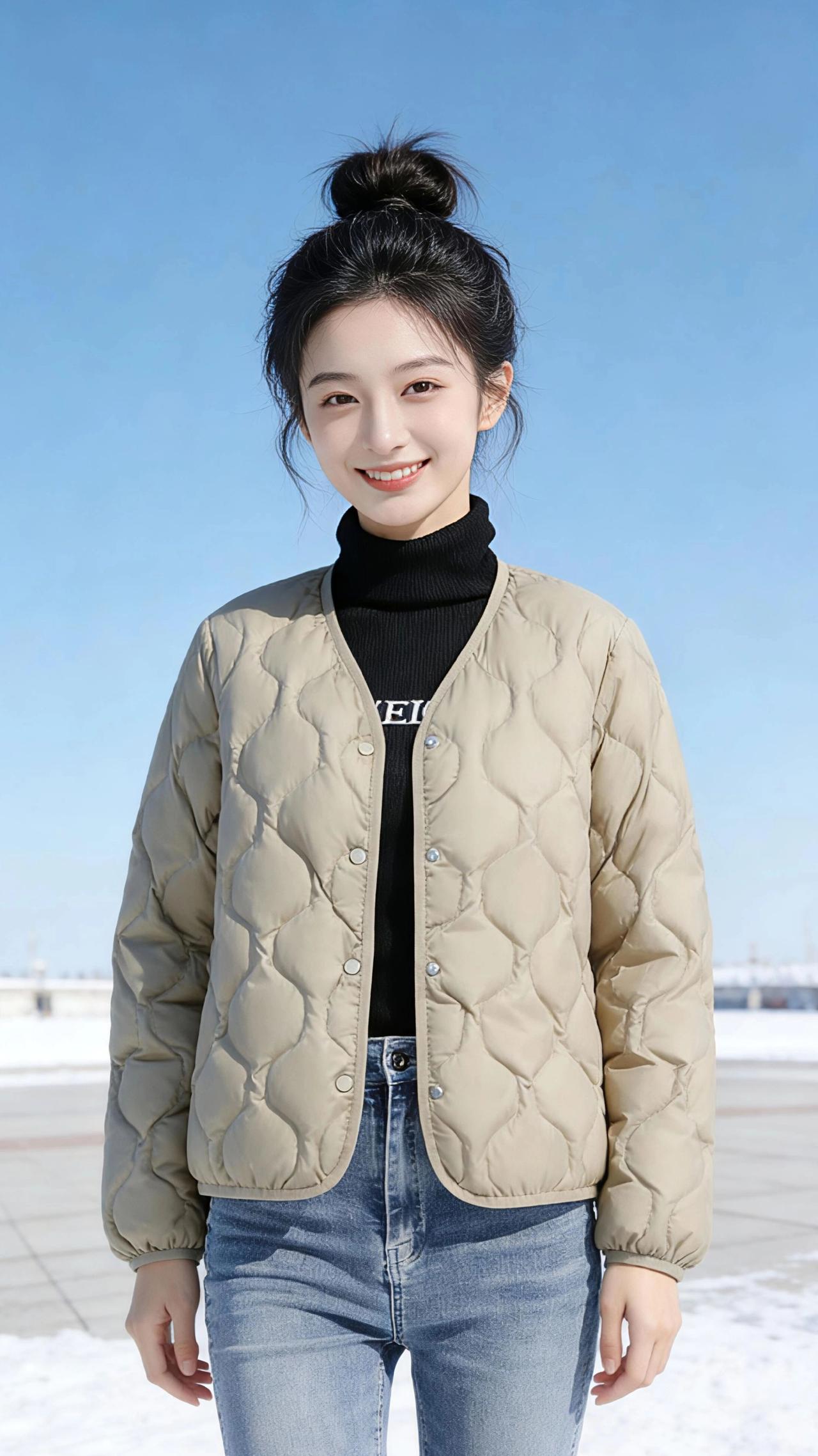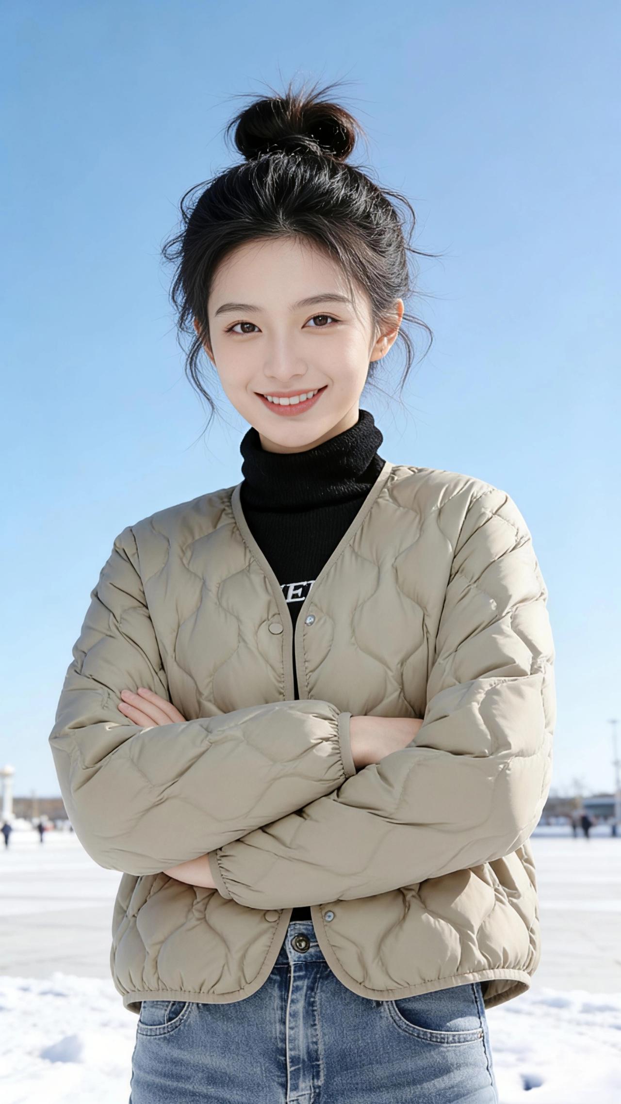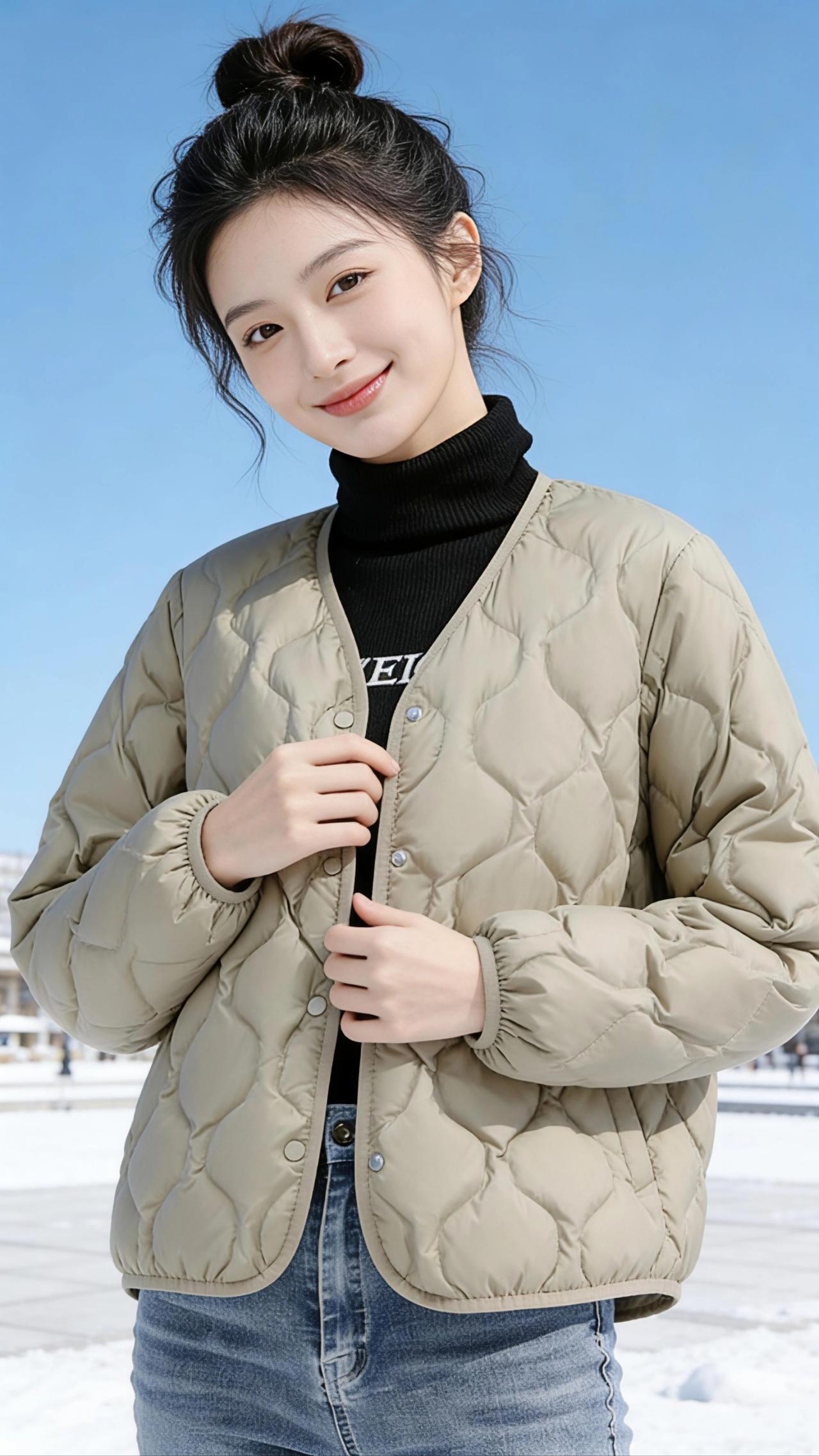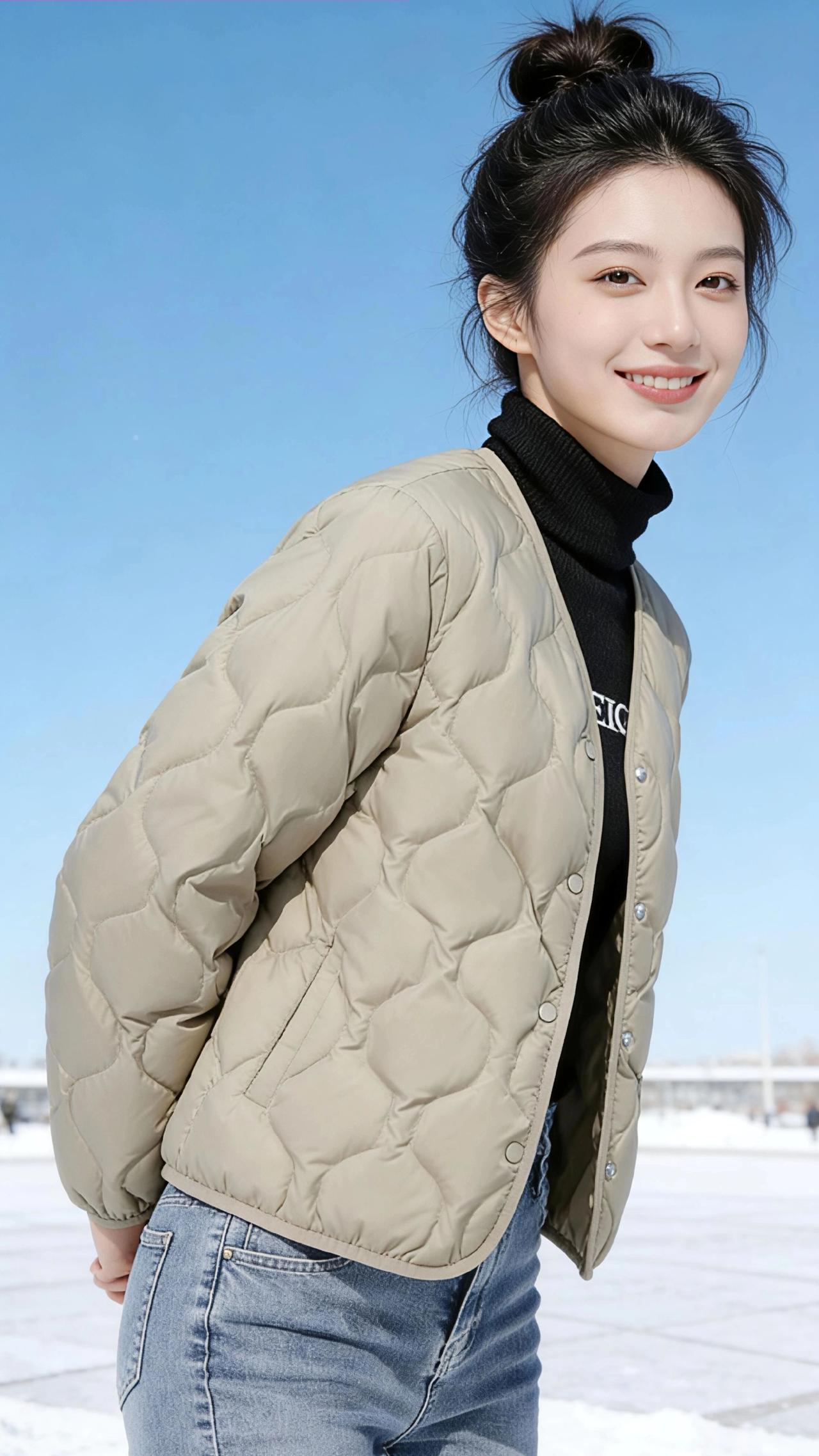 浅褐棉袄与雪晴 浅褐棉袄的菱格纹路里,盛着晴日的暖。 我立在雪后的广场上,指尖轻扣着衣扣,风掠过领口的黑针织衫,带来一点清冽的凉。蓝天像被水洗过的画布,干净得没有一丝云絮,雪粒在脚下泛着细碎的光。 后来我把手揣进牛仔裤口袋,棉袄下摆随着动作轻轻晃着,阳光落在肩头,把浅褐的面料烘得软和。侧身时,丸子头的碎发扫过耳尖,我笑着回望,看见自己的影子在雪地上,和棉袄的纹路一样温温柔柔。 高级感穿搭 新年穿搭 冬季穿搭 羽绒服