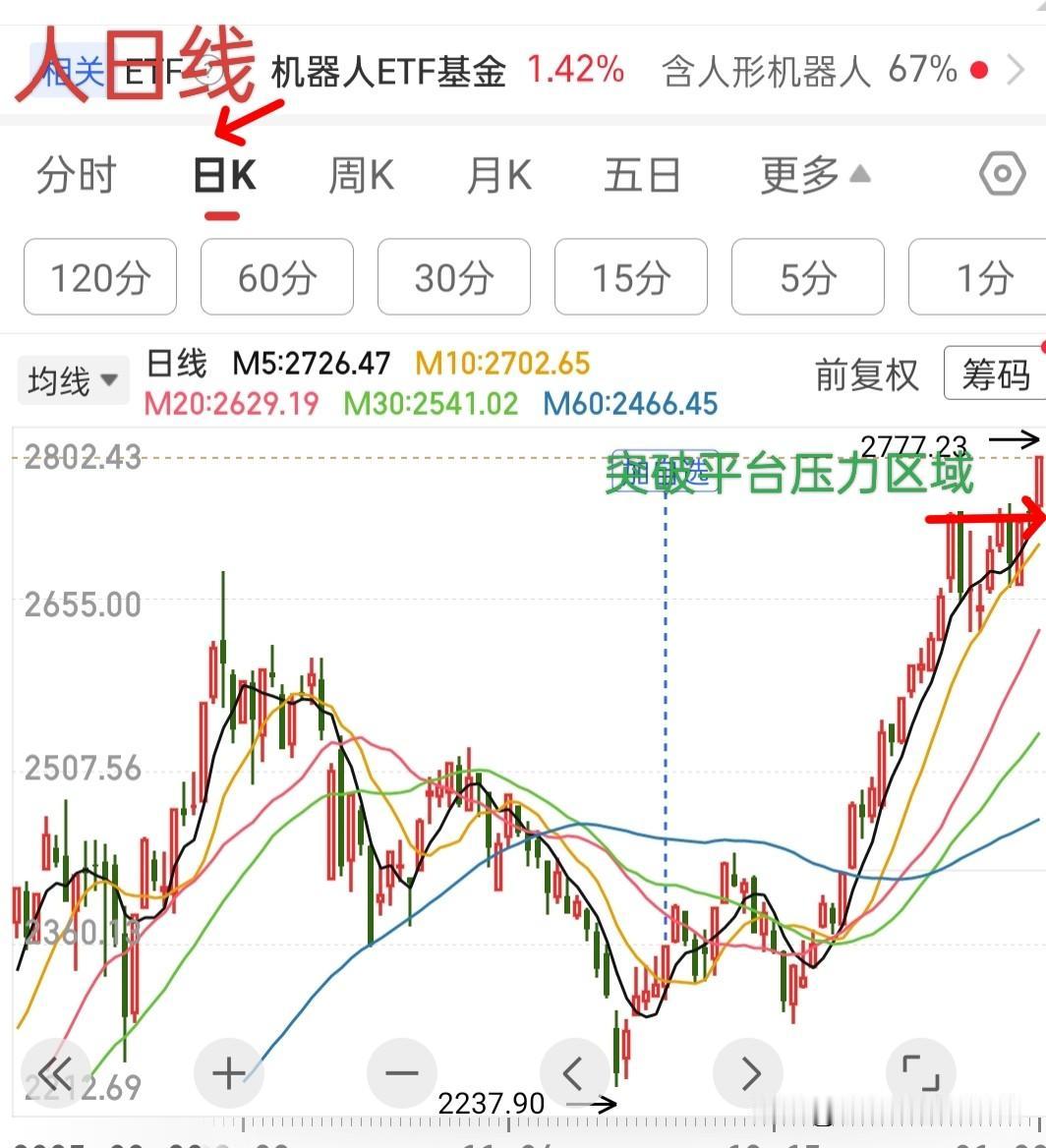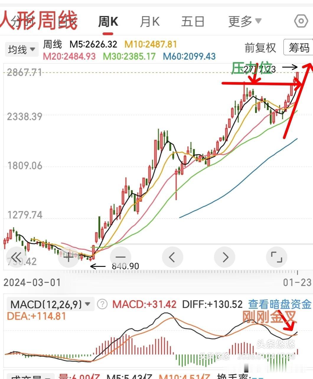 周末聊板块---这个板块日线周线均处于突破状态,还能拿多久? 下图是它的日线周线走势,日线多条均线向上散发,前面8天震荡整理了一个小区域平台,周五放量突破这个压力位,顶背离消除,为后面继续上行排除阻力,所以从日线走势还能持仓待涨。 从周线走势来看,周k线5连阳,趋势向上运行,多条均线向上散发,macd出现第三个红柱,才刚刚金叉状态,所以说从周线趋势还能持仓待涨。只要大盘不拉胯,预计周线还能再向上运行两周左右开始衰弱,年前计划止盈减仓! 只有看完本文附图才能知道是说的哪个板块,没办法,监管严格,明说不给展现。 个人观点,仅供参考,对错勿怪。点赞转发关注投资理财不迷路。