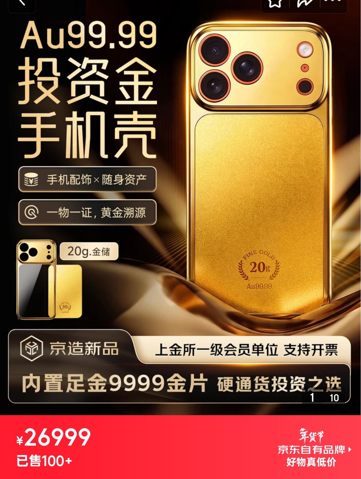 京东京造推出 iPhone 17 Pro Max 「Au99.99黄金」手机壳!其中20克的手机壳已经卖了100+。售价高达26999元!