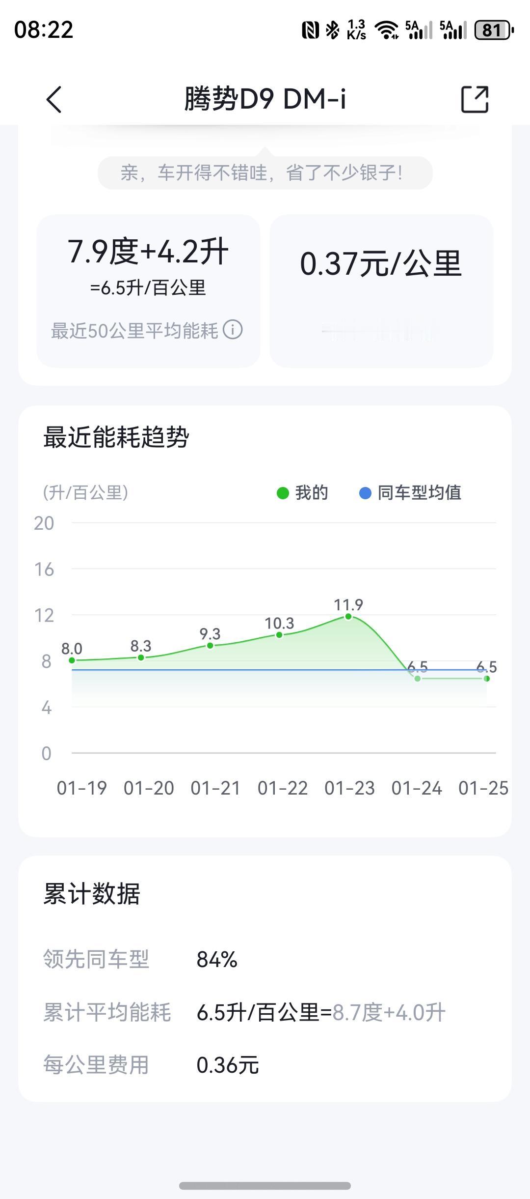 下雪天的油耗真的恐怖如斯,任你DMI 4.0、5.0也不行啊,最近开出了最高11.9的油耗。 前两天下雪加上路上结冰,一直使用比亚迪的雪地模式,该说不说,比亚迪的雪地模式确实很好用,即便在结冰的路面上也没有出现打滑的现象,当然只是在城区道路行驶过,没有在国道、省道上跑过,有经验的网友可以分享一下。 然而雪地模式也有缺点,就是耗能太高。不知道大家有没有感觉,雪地模式开启,立马感觉车身变重,有动力下降的感觉。还有就是开启雪地模式后,即便电量在70以上,车辆也会自动启动HEV模式,我在车机里问了问腾势的语音助手,回答是为了满足空调制热需求,车辆会自动启动发动机。 这几天开出了最高11.9的油耗,其实腾势D9平时还是很省油的。我开车比较肉,在市区一般就是纯电,高速110左右时速的话,油耗一般在7升左右,对于这么重的一辆车来说还是很不错的。 这款车已经开了一年,出来自驾游体验真的不错。腾势售后也很顶,后台下单可以直接上门取送车,保养一趟都不用跑。如果有时间还去店里可以免费洗车、充电,中午还可以免费蹭饭,给比亚迪腾势点赞,希望比亚迪越做越好。