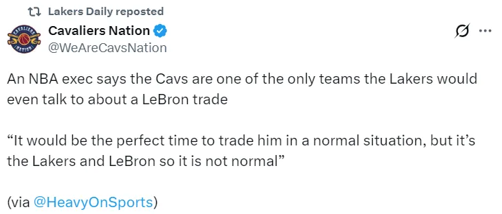 美媒《Lakers Daily》转发了另一家媒体《Cavaliers Nation》有关湖人球员勒布朗-詹姆斯与骑士交易流言的报道。 报道中指出:“一位NBA高管透露,骑士是湖人愿意就勒布朗-詹姆斯交易展开谈判的少数球队之一。” 这位高管表示:“在正常情况下,现在本该是交易他的最佳时机,但这涉及的是湖人和勒布朗——所以一切都不能按常理判断。” 勒布朗-詹姆斯本赛季场均登场33.3分钟,可以得到22.5分6.0篮板6.9助攻1.1抢断。