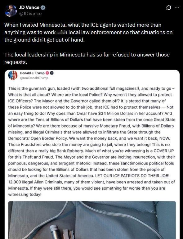 万斯谈明尼阿波利斯枪击事件:我访问明尼苏达州时,移民和海关执法局的特工最希望的是与当地执法部门合作,以便现场局势不会失控。到目前为止,明尼苏达州的地方领导层一直拒绝回应这些请求。美国移民执法行动又致1人死亡特朗普指责明尼苏达州州长煽动叛乱热点现场