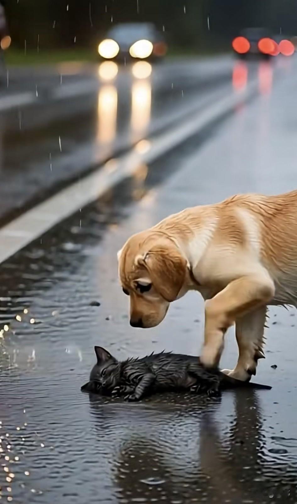 泪目了!这天一只流浪猫因为饥寒交迫晕倒在了马路上,这时候一只流浪狗发现了它,它上前用爪子推推小猫,可小猫没能醒来,眼看一辆车就要压到它,狗狗赶紧站起来逼停了汽车。 从车上走下来一位善良的老人,他仔细地查看了猫咪的状态,然后就把它们带上汽车,之后送去了宠物医院检查并打了疫苗,幸运的是猫咪只是营养不良,太久没吃东西晕倒了,调养下,再休息下一段时间就会好的,最终好心的大叔收养了它们,在他的照顾下,这只狗狗和猫咪也越来越好了。