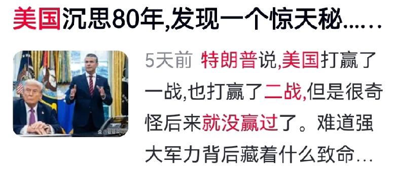特朗普那句“咋就没赢过一场”,话糙理不糙。自二战以来,美国自恃军力无双,可朝鲜战争、越南战争、阿富汗战争……哪一场不是灰头土脸? 朝鲜战场上,装备碾压的美军输给了志愿军的顽强意志;越南丛林里,高科技不敌游击战的韧性;阿富汗二十年深陷“帝国坟场”,耗资万亿最终只能黯然撤军。 再到叙利亚,强推政权更迭未成,反让俄罗斯扩大影响,自己落得个“偷油抢粮”的嘲讽。 美国并非不会打仗,而是败于贪心与傲慢。总想靠武力推行规则、维系霸权,却无视民心向背与历史规律。 从东亚到中东,一次次证明:霸权之下没有赢家,只有无尽的消耗与反噬。特朗普这话,撕开的正是美国“无敌神话”外衣下的真实伤痕。 历史给了美国一个残酷的反讽:越是渴望胜利,就越容易陷入无法取胜的战争。特朗普的疑问,或许正是这个超级大国需要面对的最真实反思。 对此你怎么看?