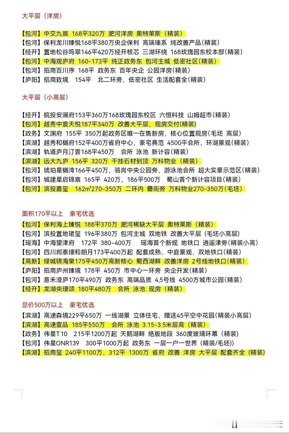 合肥在售的新计容新房和大平层豪宅。 可选择的房源很多。