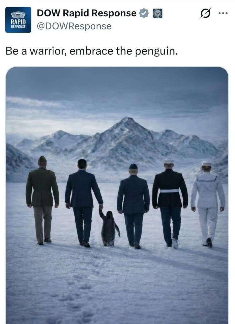 据美国媒体报道,美国国防部(五角大楼)的账号发了张图。 配文很有意思,写的是做个勇士,去抱抱企鹅吧。 从事件本源看,并非直接要抢南极,五角大楼与白宫的 “企鹅梗” 核心指向北极的格陵兰岛 。 特朗普上任后多次觊觎这片丹麦自治领地,甚至放言要获取 “全面准入权限”,白宫发布发的图片,本质是为觊觎格陵兰岛造势。 但这一荒诞表述绝非无深意,格陵兰岛位于北极,而企鹅仅分布于南半球(南极及周边),这种常识谬误恰是关键。一方面是用戏谑消解领土扩张的严肃性,另一方面也暗合美军近年对南极的战略企图。 美军内部多次渲染南极 “军事威胁”,呼吁强化极地军事建设,将北极博弈视为南极未来的预演,试图突破《南极条约》限制构建军事存在。 简言之,“抱企鹅” 表层是为格陵兰岛野心站台,底层则暴露美国对两极地区的扩张野心,南极虽非当下直接目标,但格陵兰岛模式将会被复刻到南极。