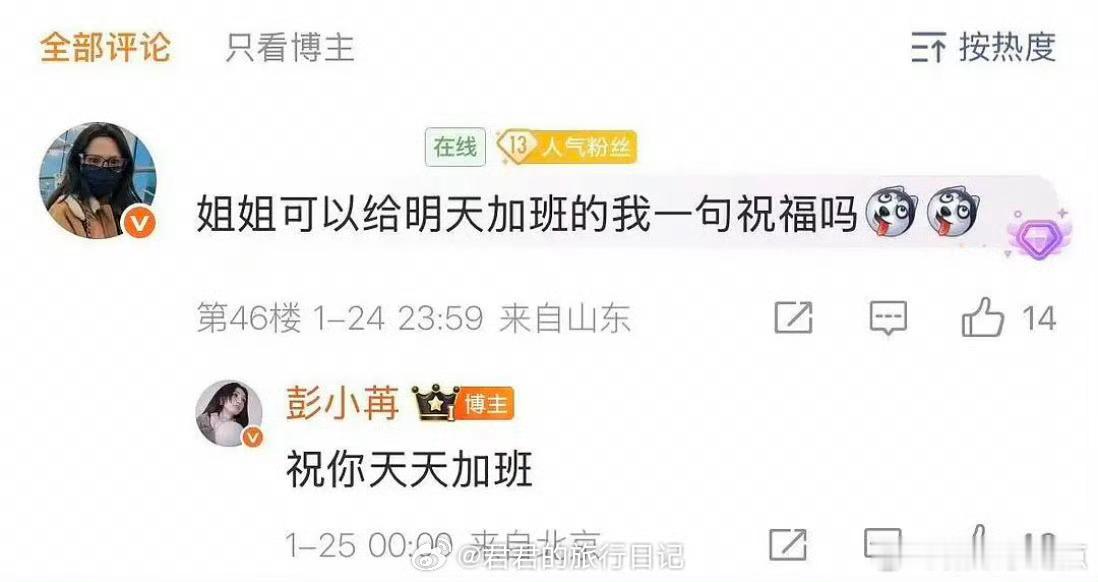 彭小苒回复粉丝“祝你天天加班”她不会觉得自己很幽默吧?们208没打过工吗?真服了🤦♂️