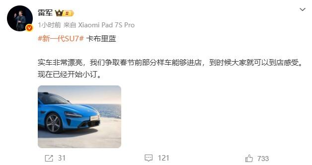 雷总表示:新一代SU7卡布里蓝实车争取春节前部分样车能够进店。 不知有朋友感兴趣
