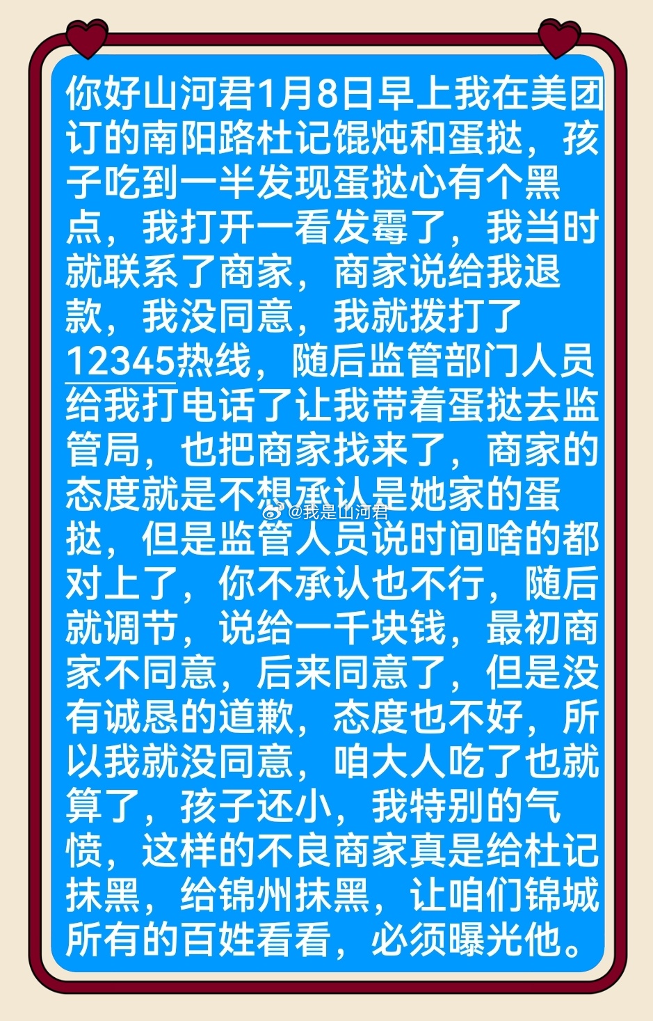 粉丝投稿 锦州南阳路杜记馄炖售出发霉蛋挞,孩子吃一半才发现!商家先是推诿不认,监管协调后仍毫无道歉诚意。这样的黑心店不配“老字号”招牌,简直给杜记抹黑、给锦州丢脸!食品安全无小事,尤其伤害孩子绝不能忍!必须公布于众,绝不让下一个孩子受害!别让更多人踩坑!亿点曝光计划点外卖时记得检查一下备注 锦州·荣鹏风味烀饼总店(人民街总店)