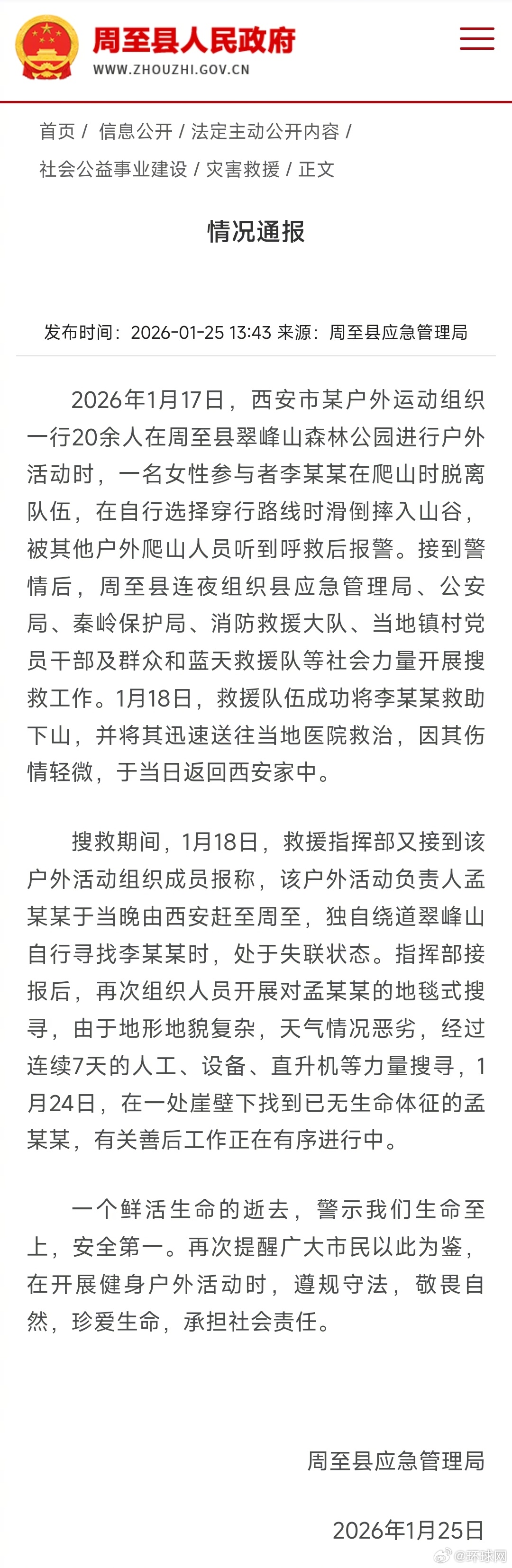 #当地通报女子爬山脱离队伍摔入山谷##户外活动负责人独寻失联女子时遇难#【西安周至县通报:一女子爬山时脱离队伍摔入山谷,后被救援队救助;户外活动负责人独寻失联女子不幸遇难】2026年1月17日,西安市某户外运动组织一行20余人在周至县翠峰山森林公园进行户外活动时,一名女性参与者李某某在爬山时脱离队伍,在自行选择穿行路线时滑倒摔入山谷,被其他户外爬山人员听到呼救后报警。接到警情后,周至县连夜组织县应急管理局、公安局、秦岭保护局、消防救援大队、当地镇村党员干部及群众和蓝天救援队等社会力量开展搜救工作。1月18日,救援队伍成功将李某某救助下山,并将其迅速送往当地医院救治,因其伤情轻微,于当日返回西安家中。搜救期间,1月18日,救援指挥部又接到该户外活动组织成员报称,该户外活动负责人孟某某于当晚由西安赶至周至,独自绕道翠峰山自行寻找李某某时,处于失联状态。指挥部接报后,再次组织人员开展对孟某某的地毯式搜寻,由于地形地貌复杂,天气情况恶劣,经过连续7天的人工、设备、直升机等力量搜寻,1月24日,在一处崖壁下找到已无生命体征的孟某某,有关善后工作正在有序进行中。一个鲜活生命的逝去,警示我们生命至上,安全第一。再次提醒广大市民以此为鉴,在开展健身户外活动时,遵规守法,敬畏自然,珍爱生命,承担社会责任。周至县应急管理局2026年1月25日