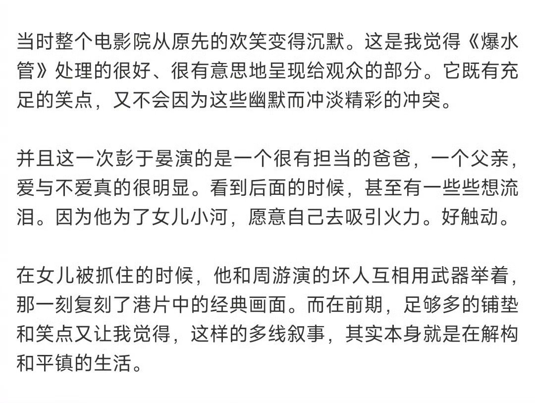 平淡的日子需要爆水管 电影的后劲很大。彭于晏演的卷王卷到警局倒闭,盗墓贼千辛万苦却徒劳无功,局长那句“我们的存在没有任何意义”引人深思。但结尾的温情与Happy Ending又给出了答案:也许意义就像“爆水管”一样,不在于结果,而在于允许一切发生,快快乐乐地活着,让水冲走烦恼,“爱你老己”,可能就是终极答案。
