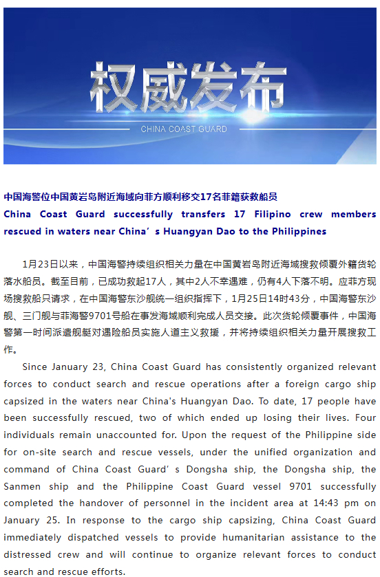 【#中方向菲方移交17名菲籍获救船员#】 1月23日以来,中国海警持续组织相关力量在中国黄岩岛附近海域搜救倾覆外籍货轮落水船员。截至目前,已成功救起17人,其中2人不幸遇难,仍有4人下落不明。应菲方现场搜救船只请求,在中国海警东沙舰统一组织指挥下,1月25日14时43分,中国海警东沙舰、三门舰与菲海警9701号船在事发海域顺利完成人员交接。此次货轮倾覆事件,中国海警第一时间派遣舰艇对遇险船员实施人道主义救援,并将持续组织相关力量开展搜救工作。