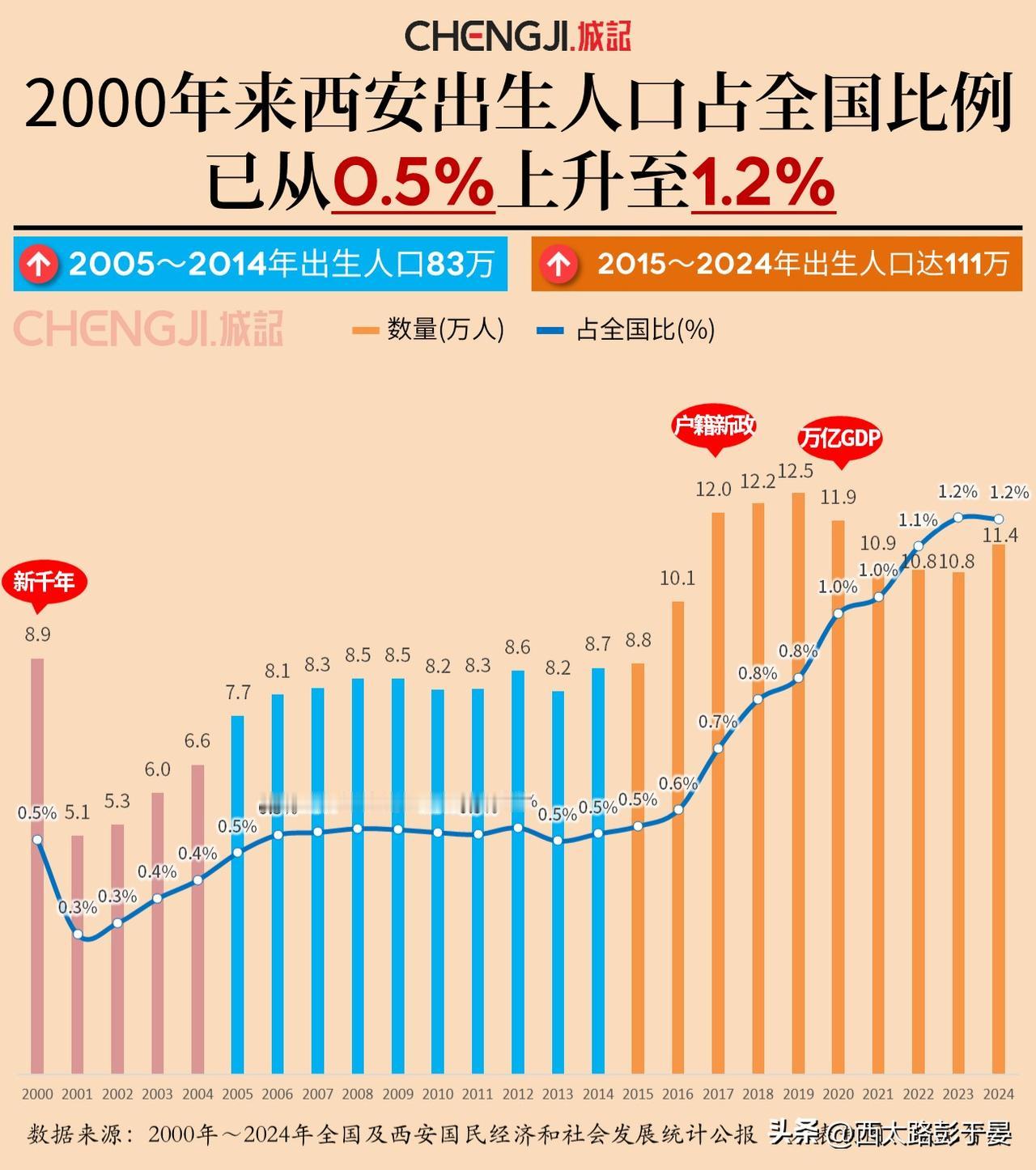 全国出生人口下行,西安却走出了逆袭路 当全国出生人口从2016年的高位一路下探至千万、800万以下时,西安却交出了一份逆势上扬的亮眼答卷 从数据来看: 2000年,西安出生人口仅占全国的0.5%,如今这一比例已攀升至1.2%,相当于每100个全国新生儿里,就有1.2个诞生在西安。 2005-2014年十年间,西安出生人口共83万;而2015-2024年这十年,出生人口直接跃升至111万,增长超33%。 这份增长的背后,是西安持续释放的城市吸引力。从2017年户籍新政放宽落户门槛,吸引百万人才扎根,到GDP突破万亿、产业布局不断优化,再到教育医疗等公共服务配套的持续完善,西安正用宜居宜业的城市底色,让越来越多年轻人愿意在这里安家、生子。 西安的出生人口逆袭,不仅是城市活力的直观体现,更是城市综合实力与发展潜力的最好证明,也为这座古都的长远发展注入了源源不断的新生力量。 西安发展 城市活力