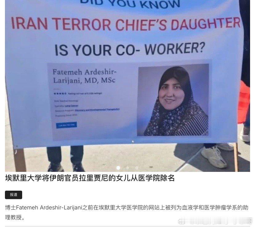 除名哈梅内伊顾问拉里贾尼的女儿在美国一所大学当老师。伊朗人大规模抗议,被拉里贾尼说成骚乱,结果她女儿被学校除名了。海外新鲜事