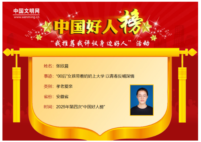 【#带着奶奶上大学的女孩荣登中国好人榜#】1月23日,中央精神文明建设办公室发布2025年第四次“中国好人榜”,安徽7人荣登榜单,其中,大皖新闻2025年11月6日曾报道的“00后”女孩张欣晨带着奶奶上大学,以青春反哺深情,感动了很多读者,她在此次评选中荣登“孝老爱亲”类别“中国好人榜”。张欣晨家在合肥市肥东县,2004年,她出生后不久就跟着爷爷奶奶生活,在爷爷奶奶的呵护下,一天天长大,留下许多快乐的回忆。然而,命途多舛,她17岁那年,爷爷因直肠癌不幸离世,2个月后,奶奶又在干活中突发脑出血,导致左侧身体瘫痪,此时她正在读中职。那年,父亲在外挣钱养家,她主动提出将奶奶接到身边,和亲戚一起照顾。第二年,她开始一个人带着奶奶生活,家校间约10公里路程,每天骑车往返两趟,一力承担起奶奶的饮食起居、康复锻炼等。几年来,她兼顾学业,自中职、高职,直至进入淮南师范学院,她都带着奶奶继续求学路。现在,奶奶在张欣晨的照料下,已能拄着拐杖慢慢行走。张欣晨说,孝敬长辈不是一句口号,而是藏在端一杯热水、多一句叮嘱的细节里。这种脚踏实地的付出,远比华丽的言辞更有力量。 张欣晨的经历告诉我们,孝亲敬老与自强不息从来都不矛盾。践行传统美德的过程,恰恰能锤炼一个人的责任与担当。(