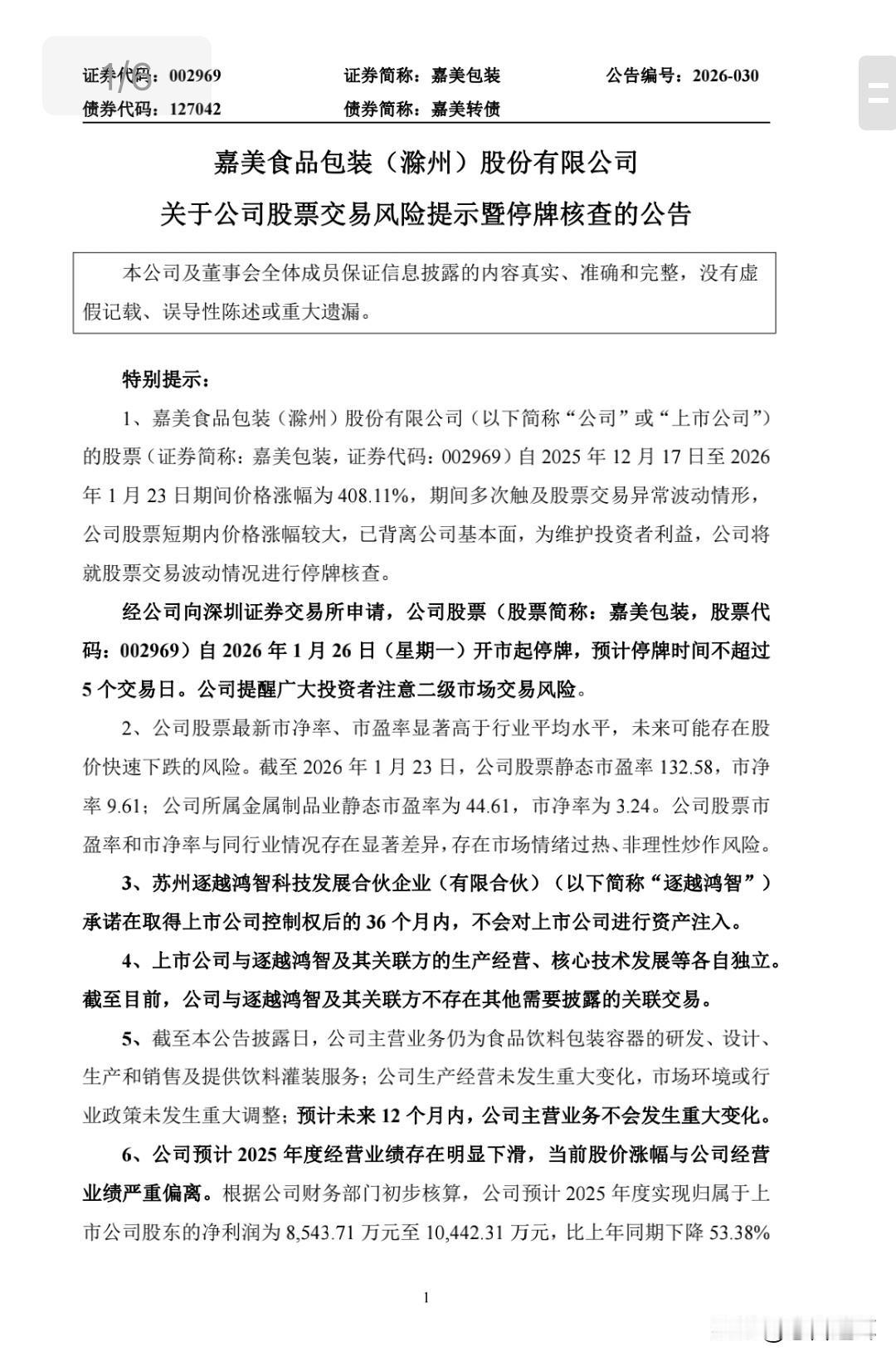 锋龙和嘉美还是没有逃掉进“小黑屋” 上周五有强烈预感它们两要进“小黑屋”,结果没有看到,但是该来的终究会来。 刚刚锋龙股份和嘉美包装双双发布公告,从1月26日停牌核查,预计不超过五个工作日。 它们可是刚刚上周停牌核查结束的,先后复盘。锋龙继续涨停板向上走;嘉美是调整后继续向上拉升,不过它走得是非常小心了,结果也没有逃脱被关的命运。 它们有个共同特点,就是短期涨幅达到了四倍,市场大热点,都是炒重组概念,加上锋龙周五有些炒作账户已经被停止交易了。 种种迹象表明,现在监管已经从严从紧了,短期十倍股应该是很难,短期大家再追高千万要小心了。