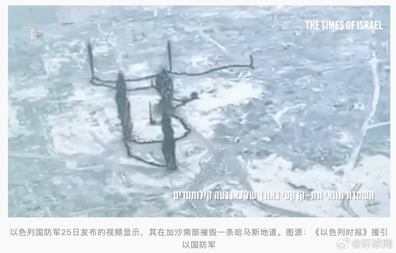 #以军曝光摧毁哈马斯地道画面#【画面曝光!以媒:以色列国防军称,在加沙南部摧毁一条长约4公里的哈马斯地道】据《以色列时报》25日报道,以色列国防军称其近日在加沙地带南部摧毁一条长约4公里的巴勒斯坦伊斯兰抵抗运动(哈马斯)地道,并发布了相关视频画面。报道援引以色列国防军的话称,上述地道内藏有武器,并设有多个供人居住的房间。以军表示,地道拆除工作始于一年前,于近日完成。此外,以色列国防军说,上周在拉法与“恐怖分子”交火并打死6名枪手后,以军在当地找到了军用装备、制造炸弹的指导手册以及至少一个爆炸装置。此外,以军称,在拉法的另一个地点发现了5个废弃的火箭弹发射器。截至发稿前,暂未看到哈马斯方面对此作出回应。