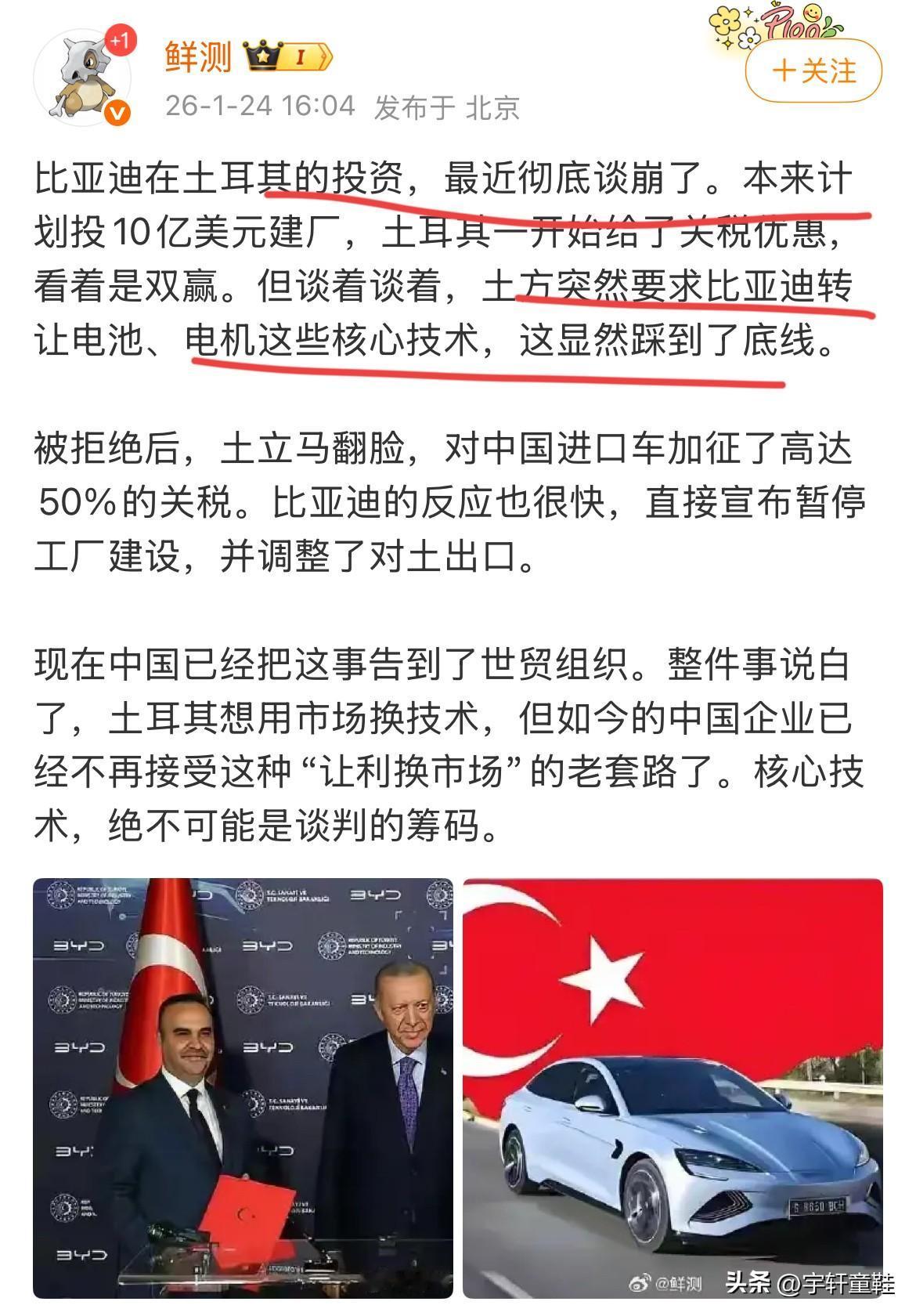 博主:“比亚迪在土耳其的投资彻底谈崩了,原因土耳其想要以市场换取比亚迪电池、电机等核心技术!” 想用市场换核心技术?土耳其这如意算盘打的,我在广东惠州都听到了!你以为比亚迪跟其他企业一样?你以为船夫哥跟别的友商掌门人一样吗?为了你那点破市场,把核心技术给你?做什么春秋大梦呢? 说实话,出这档子事,比亚迪绝对我一点都不奇怪,但要是比亚迪答应了,我才会觉得奇怪!
