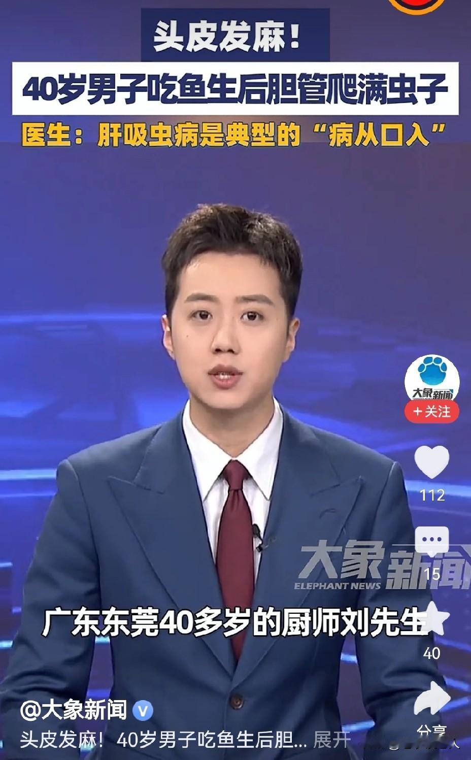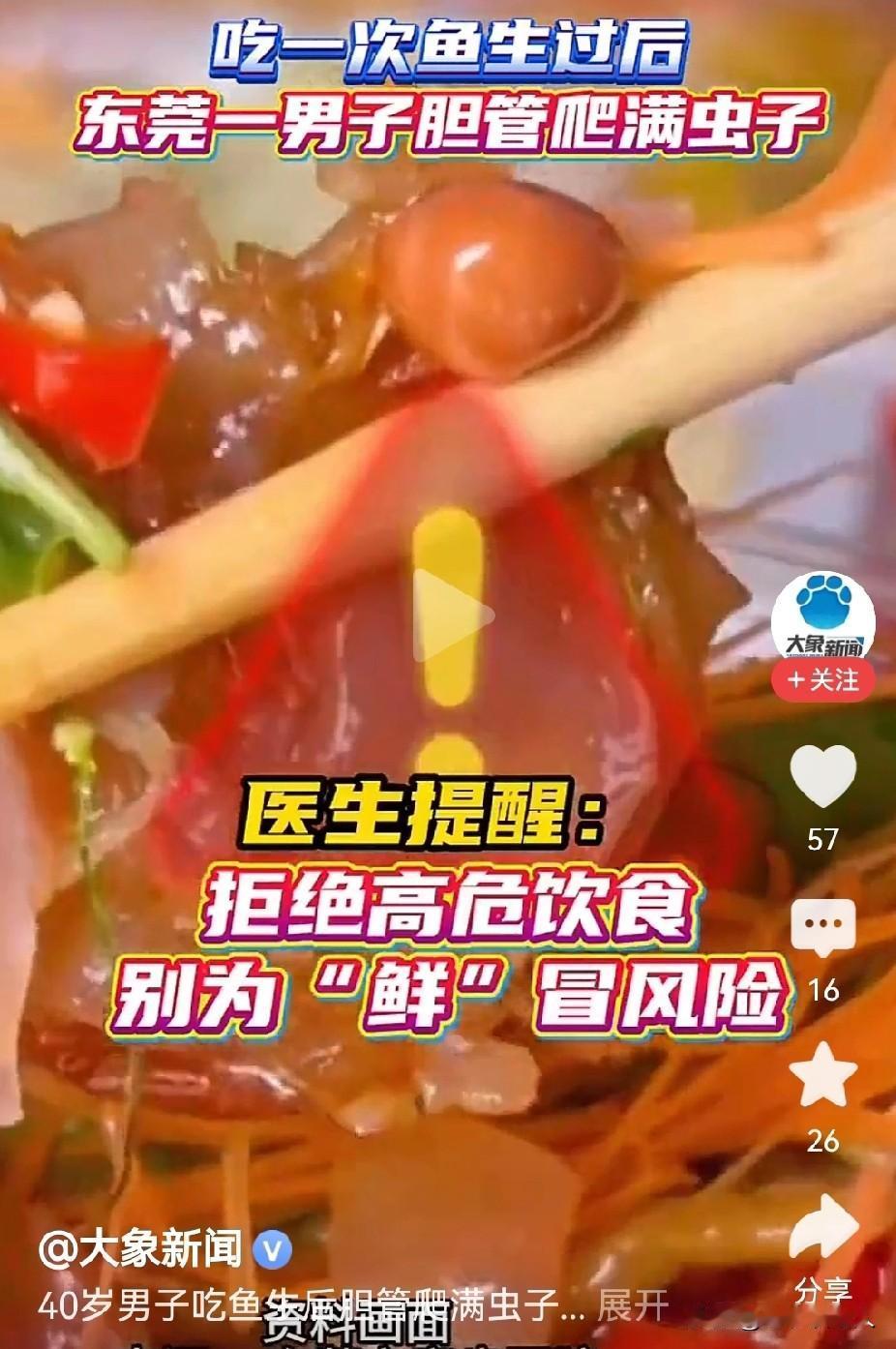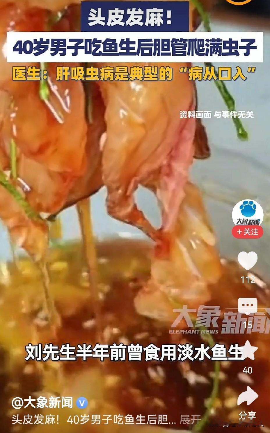 男子吃鱼生后胆管爬满虫子!是怎么回事? 何为“鱼生”?鱼生就是把活鱼切成薄片,称之为“鱼生”。 什么“鱼生”不能吃?因为,鱼是生活在水里,是一种水生生物。鱼身上寄生着非常多的,各种各样的细微的病菌和微生物。 “鱼生”是活鱼身上的肉片,寄生有很多病菌和微生物,没有通过烹饪高温杀灭,生鲜鱼片是绝对不能吃的,否则就会把这些含有危害人的身体健康的病菌和微生物,吃到身体里面去,影响人的身体健康。 据媒体1月25日报道,广州有位40多岁的厨师吃了生鱼片以后,身体出现非常的不适感,便到医院去检查。结果医生发现,该患者的胆囊管内面有非常多的细小的虫子在缓慢的蠕动。通过确认,这是一种叫做“肝吸虫”的微生物,是寄生在水产品上面的一种细微的生物,如鱼、螃蟹、对虾等水产品,对人的肝脏和胆囊有非常大的危害性。 因此建议大家在出差的时候,或在日常生活中,千万不要相信“鱼生”的美味,不要相信鱼生的营养丰富,千万不要去品尝,要远离“鱼生”。吃鱼生必须要吃煮熟煮透的,杀死了寄生虫的鱼生。这样的鱼生才有营养,才是美味,才是对身体有健康的美食。 以上是本人观点,如有不妥,请大家在留言区留下你宝贵的意见,并积极参与评论。