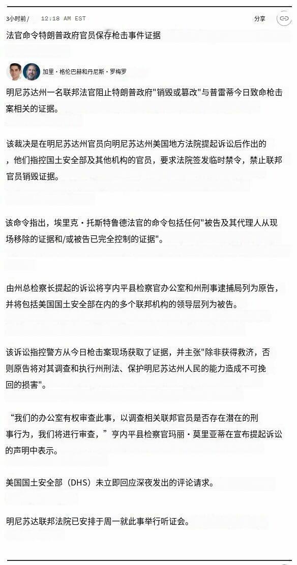 新闻快讯——明尼苏达州联邦法官禁止特朗普政府销毁或篡改与亚历克斯·杰弗里·普雷蒂遭致命枪击案相关的证据。——美国全国广播公司