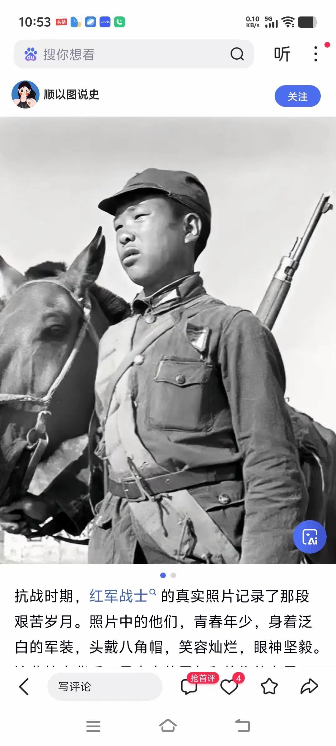 这是在网上刷到的照片,不用说,看那头上的五角星,看那粗麻布的裤子,就是红军战士。再看他的上身,枪和皮带全清晰的显现在外面,在那个吃不饱饭的艰苦年代,尽管如此,他的眼睛非常有神!看到这样的图片,每一个中国人心里会沉甸甸地。把祖国建设成富强的现代化强国,以告慰先烈们! 那五角星磨得都有点发白了,粗麻布裤子上还打着好几块补丁,针脚歪歪扭扭的,一看就是自己缝的。上身的单衣薄得能透光,枪套磨得发亮,皮带勒得紧紧的,估计是想让自己看起来精神点,也可能是肚子里没粮,勒紧点能扛饿。就这条件,他眼里那股劲儿一点没减,亮得像黑夜里的星星,透着一股子不服输、不放弃的狠劲。 想想那时候的日子,不是爬山就是涉水,吃的是草根树皮,喝的是雪水溪水,冬天没有棉衣,夏天没有凉棚,还要面对敌人的围追堵截。枪里的子弹可能都不够用,手里的刀可能都卷了刃,可他们照样往前冲,就为了能让后人过上好日子。咱们现在坐在空调房里刷着手机,吃着热饭喝着热水,出门有车,回家有网,这些在当年都是想都不敢想的奢饰品。 再看看照片里战士的眼神,那是对胜利的渴望,是对祖国的热爱,是对老百姓的牵挂。他们可能年纪不大,有的甚至还是个孩子,却扛起了保家卫国的重担。多少人倒在了长征路上,多少人牺牲在战场上,连名字都没留下,就凭着一颗红心、一把钢枪,硬生生打出了一片新天地。 现在的中国越来越强,高楼大厦遍地起,高铁飞机四通八达,航母游弋在深海,空间站遨游在太空。这些成就不是天上掉下来的,是先烈们用鲜血和生命换来的,是他们用挨饿受冻、浴血奋战拼出来的。每次看到这样的老照片,心里就堵得慌,既心疼他们的遭遇,又敬佩他们的勇气。 咱们没经历过那样的苦,更得珍惜现在的甜。好好工作,好好生活,把自己的日子过好,把祖国建设得更富强,就是对先烈们最好的告慰。别让他们的血白流,别让他们的牺牲没了意义,这是每个中国人都该记在心里的事儿。 各位读者你们怎么看?欢迎在评论区讨论。