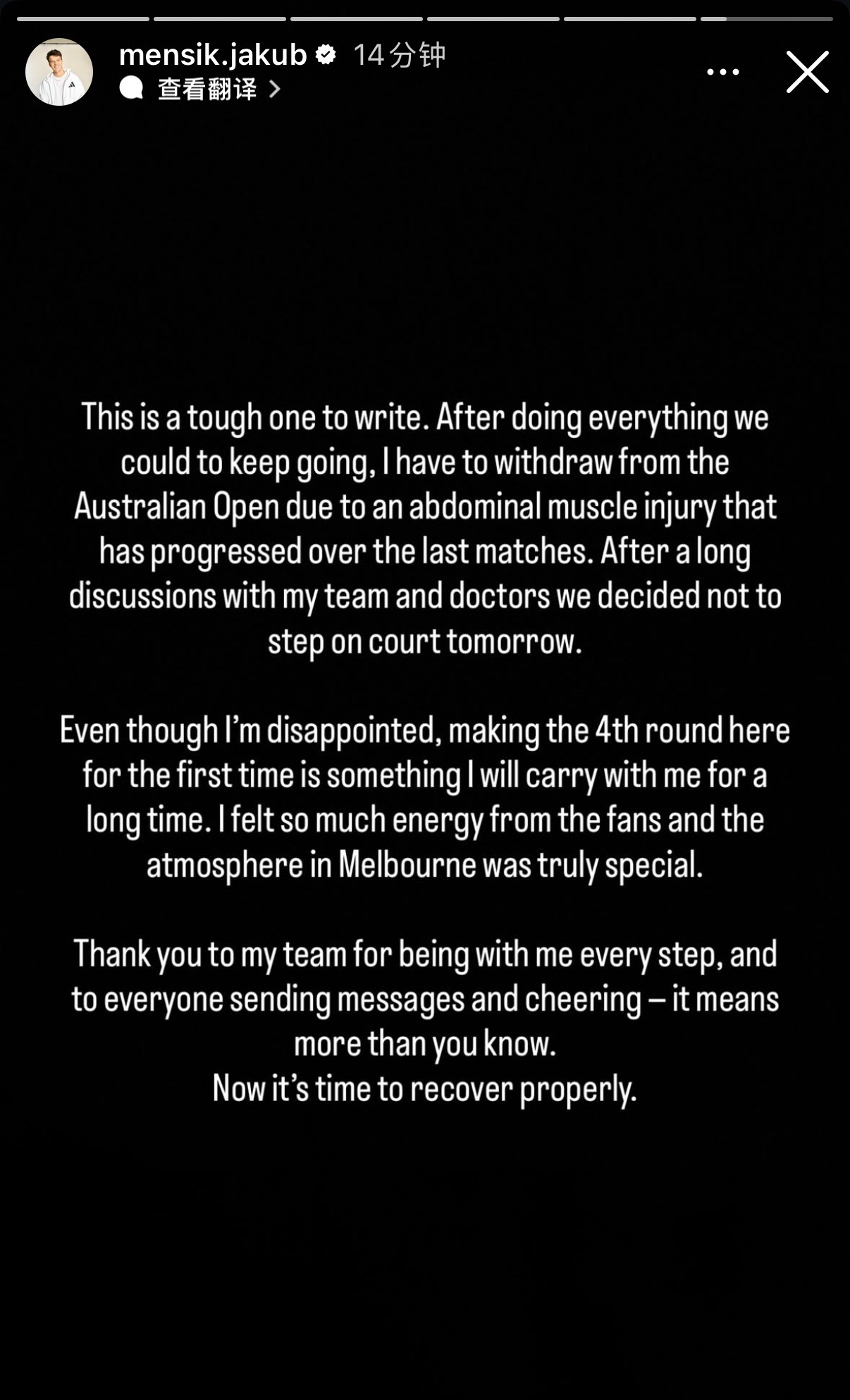 首进大满贯16强的门希克宣布因伤遗憾退出澳网德约不战而胜晋级八强。🇨🇿门希克:“写这封信时心情很沉重。尽管我们已竭尽全力坚持,但由于腹肌伤势在最近几场比赛持续加重,我不得不退出澳网。经过与团队和医生的多次沟通,我们最终决定明天不再出战。虽然心有遗憾,但首次闯入澳网16强的经历将长久留在我心中。我深切感受到了球迷们的支持和能量,墨尔本的现场氛围也真的非常特别。感谢我的团队始终陪伴左右,也感谢每一位发来信息和为我加油的人——你们不会知道这对我意味着什么。现在是时候好好康复了。”门希克澳网因伤退赛德约科维奇收退赛礼晋级澳网八强澳网2026
