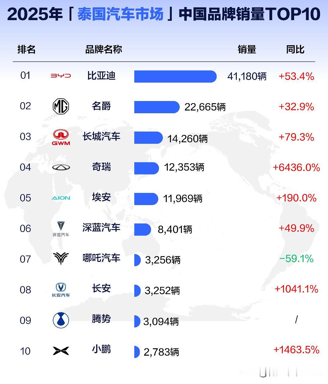 2025年泰国品牌销量,中国品牌销量TOP10 丰田和本田打入泰国市场,牢牢的占领第一位和第二位,第三名就是中国销售最大的比亚迪,也来到了第三名。进入泰国前10名的车企中,有5名是中国的车企,这个战绩已经很不错了。已经占了一半了 品牌销量前3名为:丰田、本田、比亚迪,销量分别为:169208辆、71510辆、41180辆。 中国品牌销量前3名为:比亚迪、名爵、长城汽车,销量分别为:41180辆、22665辆、14260辆。