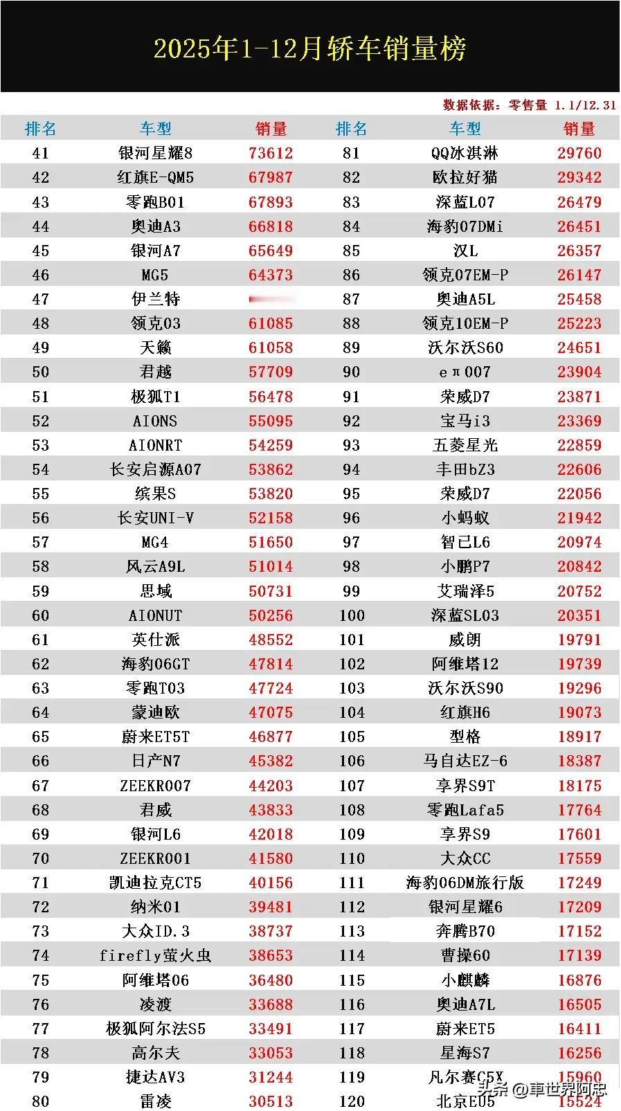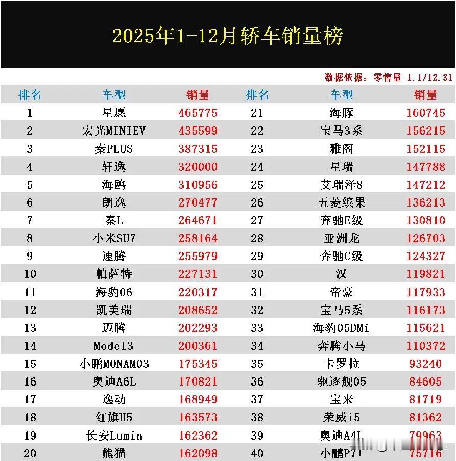 日前,2025年轿车零售量排行榜已正式公布了!经过一年的激烈竞争,这一细分市场谁才是最后的大赢家,我们一起来看看吧? 从榜单数据来看,新能源车型大胜已是板上钉钉的事实了,独揽前三名,但排名方面却与去年大不相同。其中2024年的销量冠军比亚迪秦PLUS痛失冠军,而吉利星愿则成功崛起了,去年销量仅有5万多辆,今年销量则爆发式增长达到了46.5万辆,真正实现了遥遥领先。燃油车日产轩逸、朗逸则保持较为稳定的表现,两者销量继续突破27万辆,小米SU7也是榜单里面的一大亮点排名杀入前8名,销量为25.8万辆!