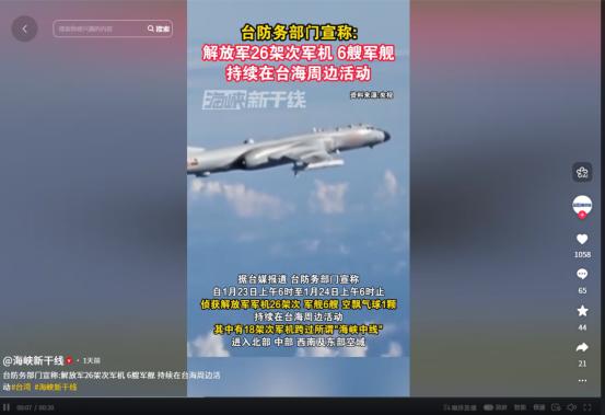 公然挑衅?2026年1月24日,台“国防部”宣布:24小时里,侦获解放军机26架