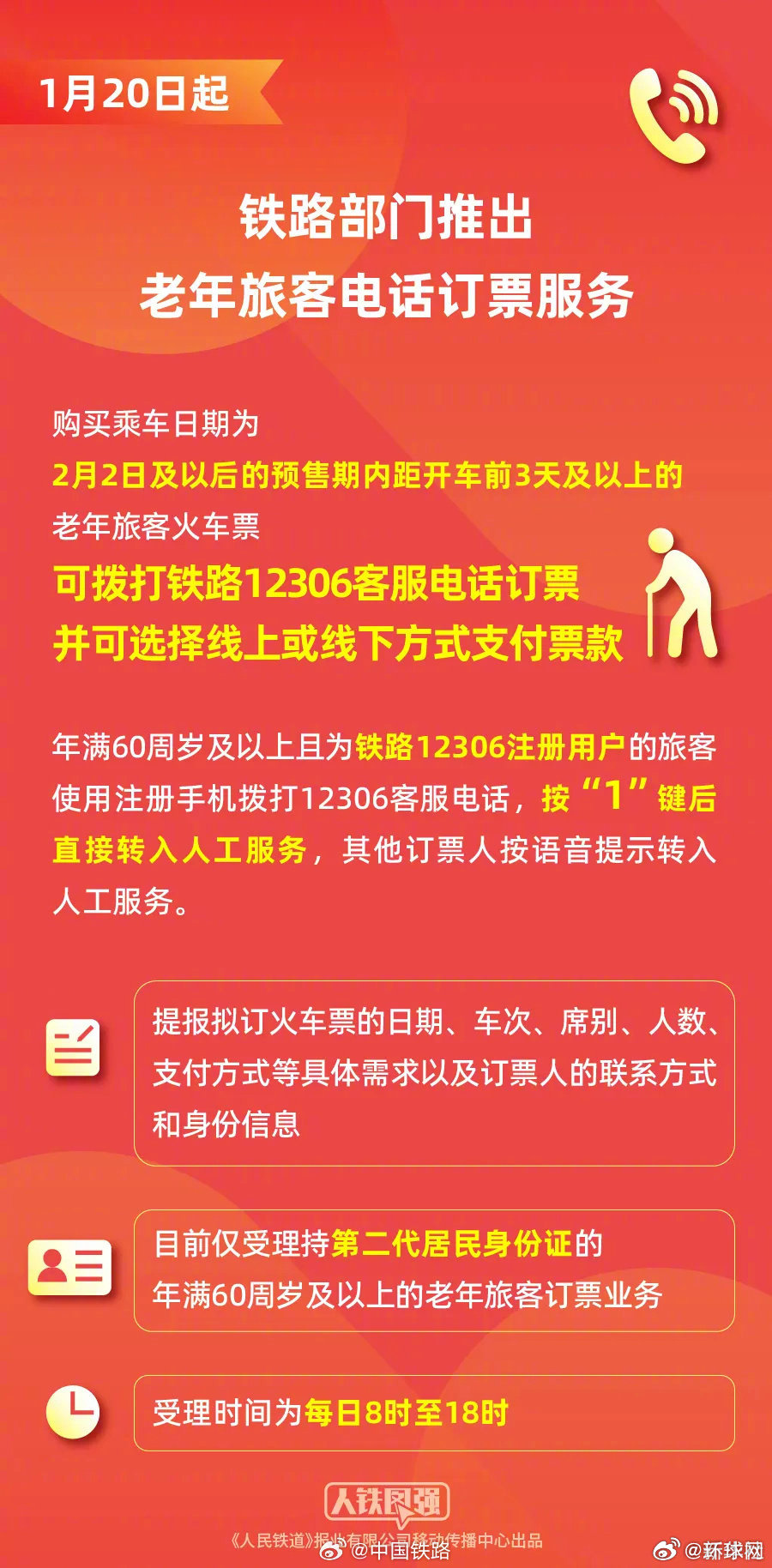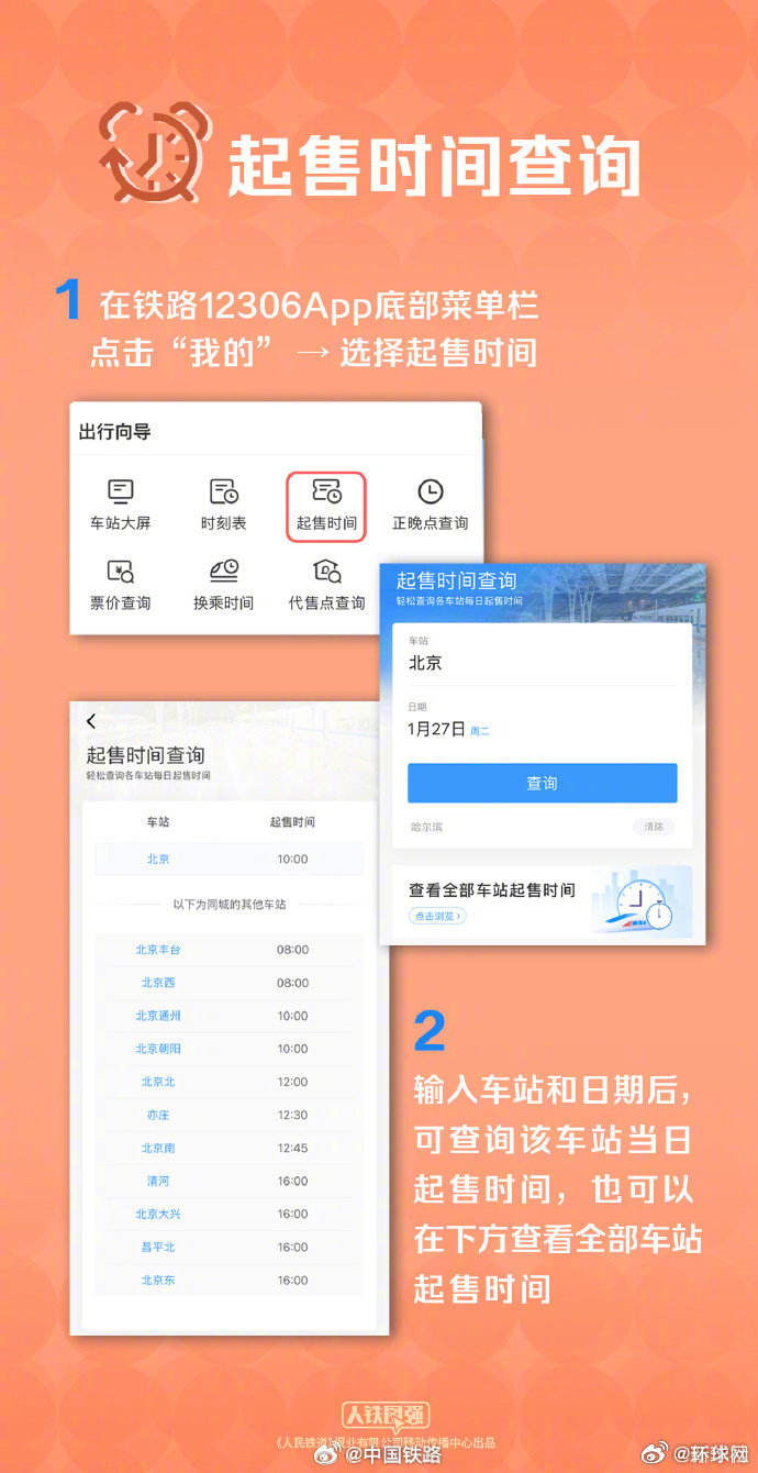 #春运购票你想了解的都在这#【#2026春运购票全攻略#】2026春运购票,你关心的都在这儿↓【起售时间查询】打开铁路12306App→选择“我的”→点击“起售时间”,输入车站和日期后,可查询该车站当日起售时间,也可以在下方查看全部车站起售时间。【起售时间提醒】打开铁路12306App→首页选择日期→选择要乘车日期→点击“设置提醒”,即可跳转“订阅提醒”→选择“出发车站”后,点击“添加提醒”即可。【购票信息预填】在车票起售当日,预先填写乘车人、车次、席别等信息,在车票开始发售时,一键提交订单即可。【候补购票】打开铁路12306App,在购票界面点击候补,最大限度使用60个“日期+车次”的购票组合,选择的组合越多,候补成功率更高。【误购限时免费退票】通过铁路12306平台购买乘车日期为2月2日及以后火车票时,如误购车票在购票支付成功30分钟内且在开车前4小时以上,购票人可线上自助办理退票,不收取退票费。【老年旅客电话订票服务】购买乘车日期为2月2日及以后的预售期内距开车前3天及以上的老年旅客火车票,可拨打铁路12306客服电话订票,并可选择线上或线下方式支付票款。铁路部门提示,铁路12306网站(含手机客户端)是中国铁路唯一官方火车票网络售票平台,致力于为广大旅客提供公平公正、安全便捷的购票出行服务,从未与任何第三方平台机构开展合作,没有任何购票加速包、购票会员费、挑选车厢座位费等额外收费,发生改签、退票时严格按规定办理,同时严格依法保护旅客个人信息安全。请广大旅客朋友一定要通过铁路官方渠道购票,认准12306官方网站和“铁路12306”官方App。(中国铁路)