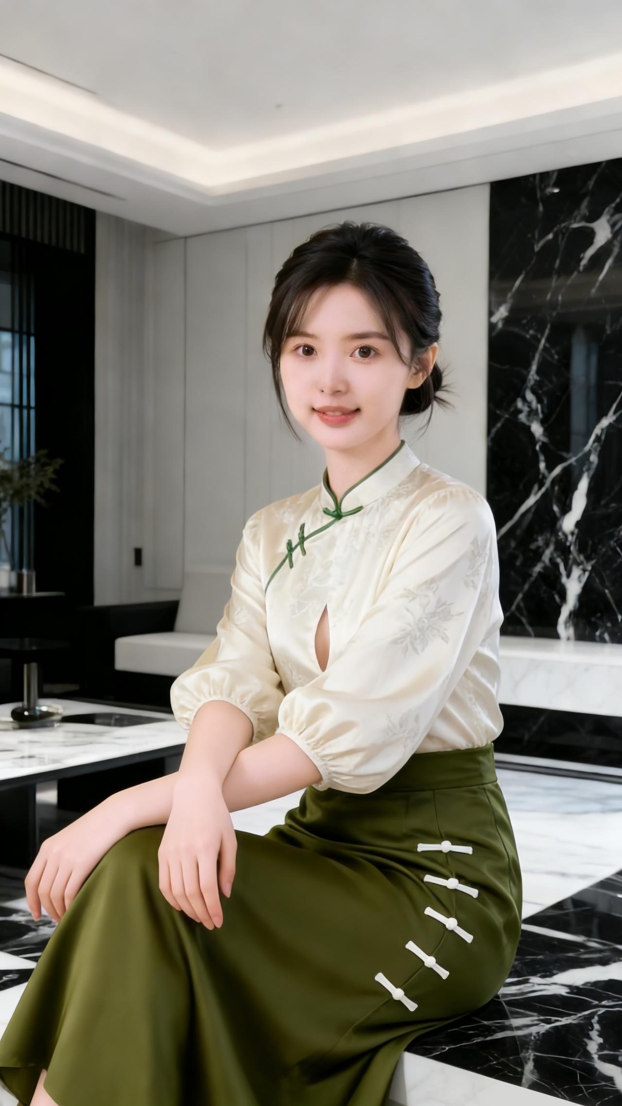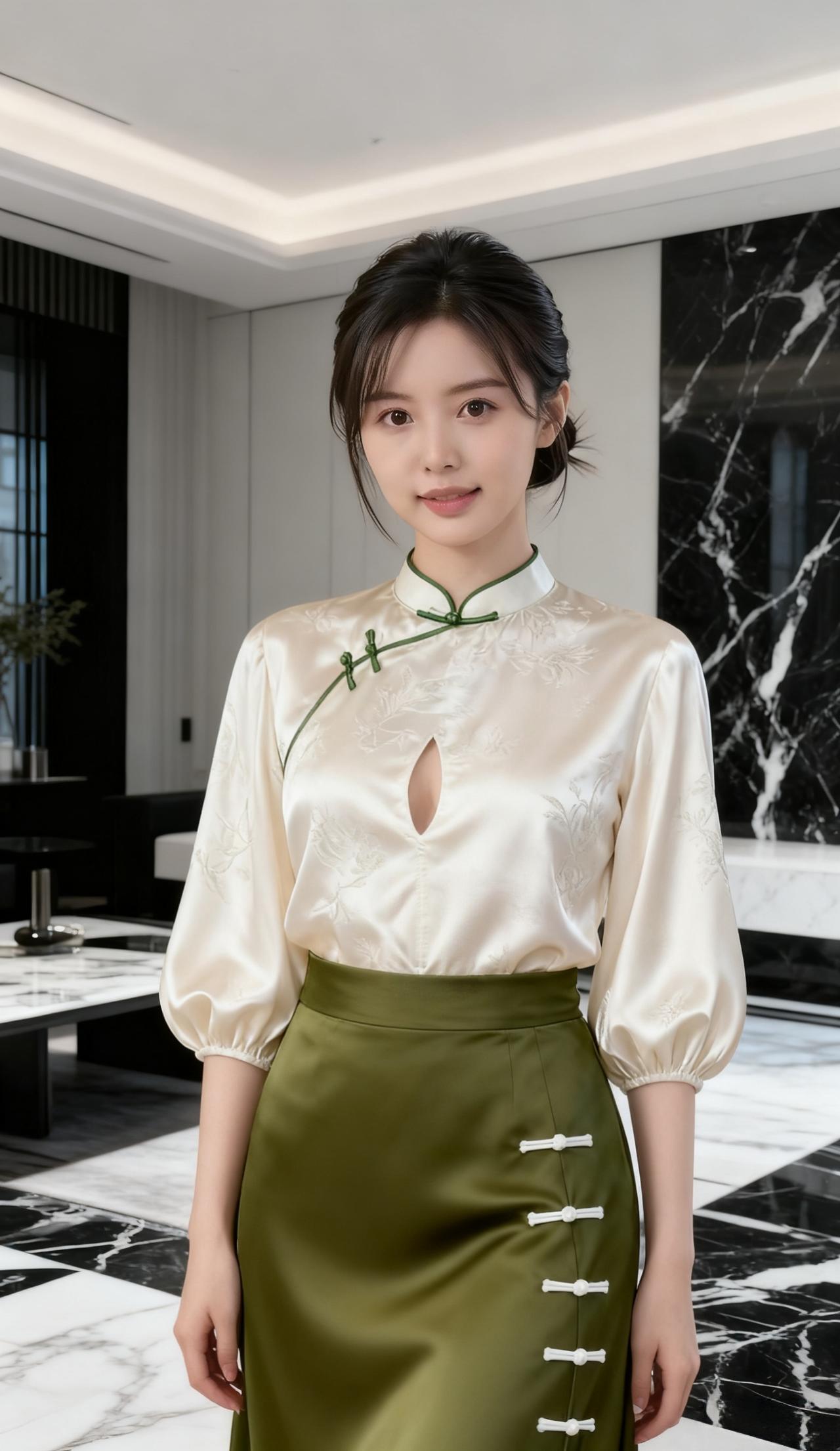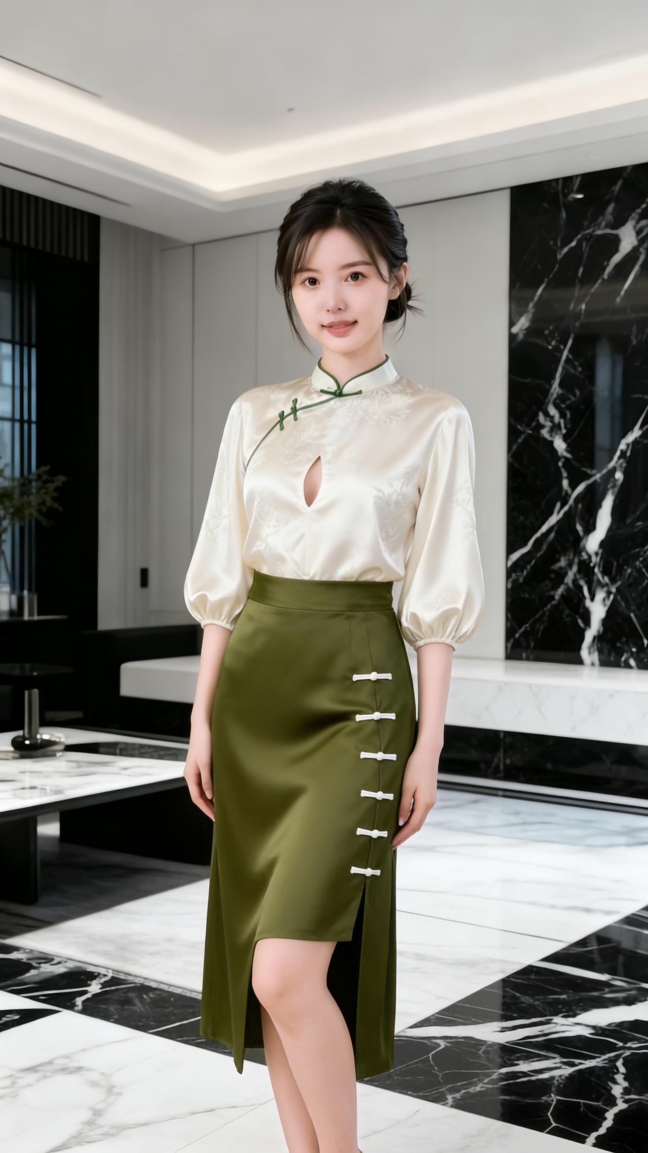 上衣是米白色暗纹提花缎面材质,小圆领搭配精致的绿色盘扣,正中的镂空设计,灯笼袖的版型柔和又显气质。 下装是同系列的橄榄绿高腰半身裙,裙身点缀着白色盘扣,与上衣的绿色装饰形成呼应,配色和谐又富有层次感,整体造型既显东方韵味,又不失现代优雅。