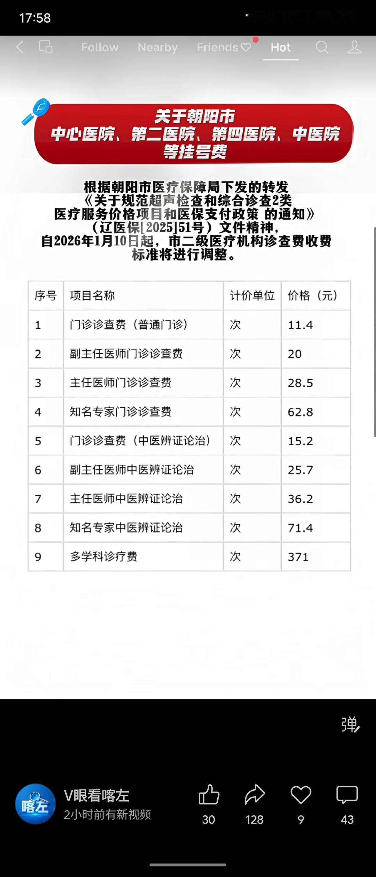 某地级市城市医疗机构2026年最新门诊诊查费价格。普通门诊11.4元/次,副主任医师、主任医师、知名专家门诊费用逐级递增,分别为20元、28.5元和62.8元。中医辨证论治同类项目价格略高。多学科诊疗费显著高于普通门诊,为371元/次。价格体系体现了按医师职称及服务复杂性分级的收费结构。