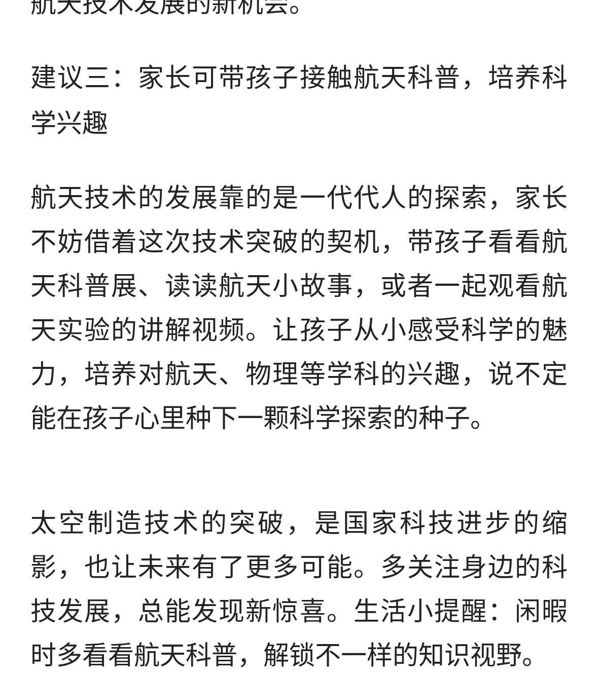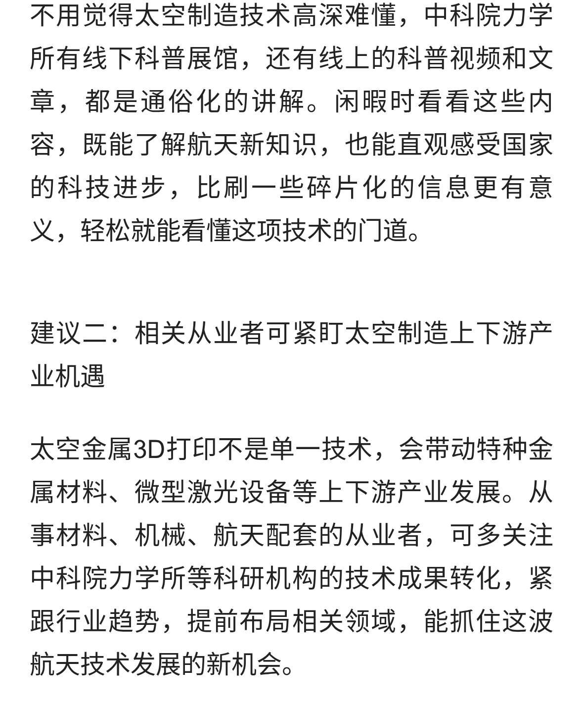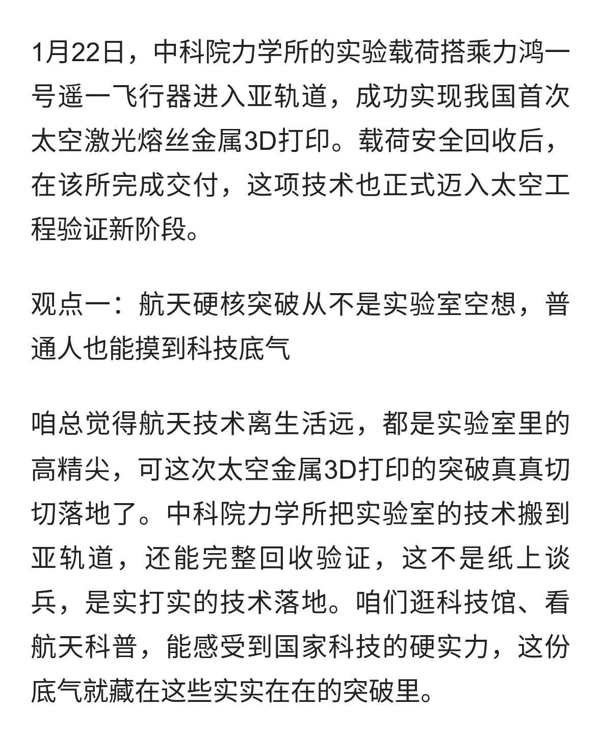 中国太空金属3D打印技术突破:实验详情与战略意义 2026年1月22日,中国科学院力学研究所自主研制的微重力金属增材制造载荷,搭载中科宇航力鸿一号遥一飞行器完成亚轨道飞行实验,首次在太空微重力环境下成功制造出完整金属构件。本次实验实现从地面研究到太空工程验证的关键跨越,突破微重力环境下金属成形核心技术瓶颈,构件致密度超92%,力学性能一致性较地面产品提升30%,整体技术达世界一流水平。该突破重构航天制造逻辑,为航天器在轨维护、大型空间设施建设及深空探测提供全新技术路径,对我国航天强国建设具有里程碑意义。 一、实验核心详情 (一)实验系统构成与任务流程 本次实验是我国首次基于火箭平台的太空金属增材制造返回式科学实验,核心系统由载荷装置、运载平台及回收系统组成。实验载荷由中科院力学所自主研制,重量不足30公斤、功耗低于500瓦、体积仅0.5m×0.3m×0.4m,满足太空载荷轻量化、小型化要求。运载平台力鸿一号遥一飞行器攀升至120公里高空,提供超300秒高品质微重力环境。 实验实现全闭环验证:飞行器入轨后载荷启动激光熔丝增材制造程序完成打印,在轨实验结束后载荷舱伞降回收,科研团队同步获取完整过程数据与性能参数。 (二)关键技术突破 研发团队针对太空微重力制造难题攻克三大核心技术:1. 物料稳定输运与成形技术,通过电磁吸附约束熔融金属流动,优化粉末配方,打印精度控制在±2微米,构件合格率超90%;2. 全流程闭环调控技术,搭载传感器与高清相机实时捕捉制造动态,实现地面动态参数调整,解决真空热场控制难题;3. 载荷-火箭高可靠协同技术,保障复杂飞行环境下制造稳定性,验证亚轨道回收技术可靠性。 (三)实验成果参数 回收的金属构件致密度达92%以上,力学性能一致性较地面提升30%,可实现复杂结构一体化制造。科研团队同时获取微重力下金属增材制造的完整数据库,为技术迭代奠定核心基础。 二、技术突破的重大意义 (一)航天制造模式的革命性变革 该技术颠覆“地造天用”传统逻辑,推动航天制造向“天造天用”转型。突破火箭整流罩尺寸与运力限制,可在轨制造超大尺寸结构件,同时将航天器零部件补给周期从“月级”压缩至“小时级”,长期有望降低航天运维成本60%以上,为我国低轨卫星星座规模化运营提供保障。 (二)深空探测与地外开发的关键支撑 技术为深空探测“地外自持”提供核心支撑,未来可利用月壤、小行星矿产等原位资源作为打印原料,制造基地结构件、设备零件等,将地外探测物资补给成本占比从40%以上压缩至20%以下,解决深空探测补给难题,成为我国深空探测战略的重要技术基石。 (三)国际太空竞争的战略制高点 当前太空制造是全球空间技术竞争核心领域,我国此次突破跻身国际第一梯队,自研载荷相较美国同类设备更轻量化、低功耗,成形精度与构件合格率均实现超越。同时践行产学研协同创新模式,为我国在太空制造新兴赛道抢占国际话语权提供制度保障。 (四)产业链升级的辐射带动效应 技术突破将带动上下游产业链协同升级,上游推动特种金属粉末、高精度传感器等材料与零部件技术迭代,下游加速商业火箭、卫星制造等产业提质增效。结合地面应用经验,将进一步降低商业航天准入门槛,我国有望凭借技术优势占据全球3D打印火箭市场重要份额。 综上所述,中国首次太空金属3D打印实验的成功,是我国航天制造领域的里程碑事件。突破微重力环境下金属成形核心技术瓶颈,实现从地面研究到太空工程验证的关键跨越,技术参数与系统可靠性达世界一流水平。该突破不仅重构航天制造逻辑,解决航天运维与深空探测核心痛点,更在全球太空竞争中抢占战略制高点,为我国航天强国建设注入强劲动力。未来随着在轨制造平台的研发应用,太空金属3D打印技术将从实验走向产业化,推动人类太空探索进入“地外自持”全新阶段。