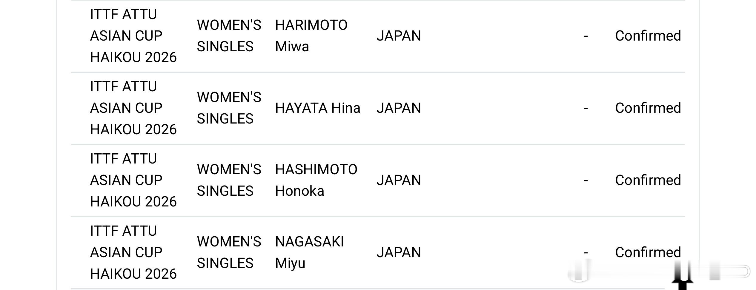 赤江夏星递补2026海口亚洲杯日本女队目前名单:张本美和、早田希娜、桥本帆乃香、长崎美柚、赤江夏星