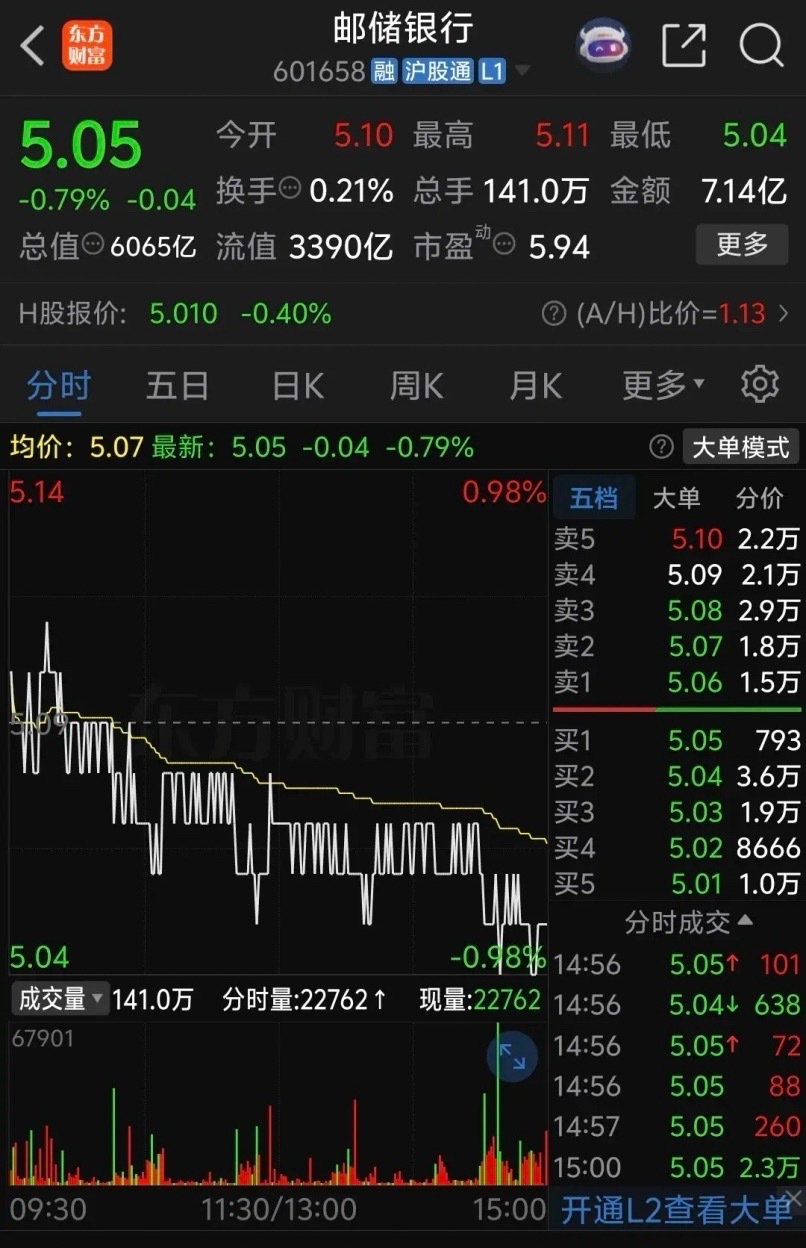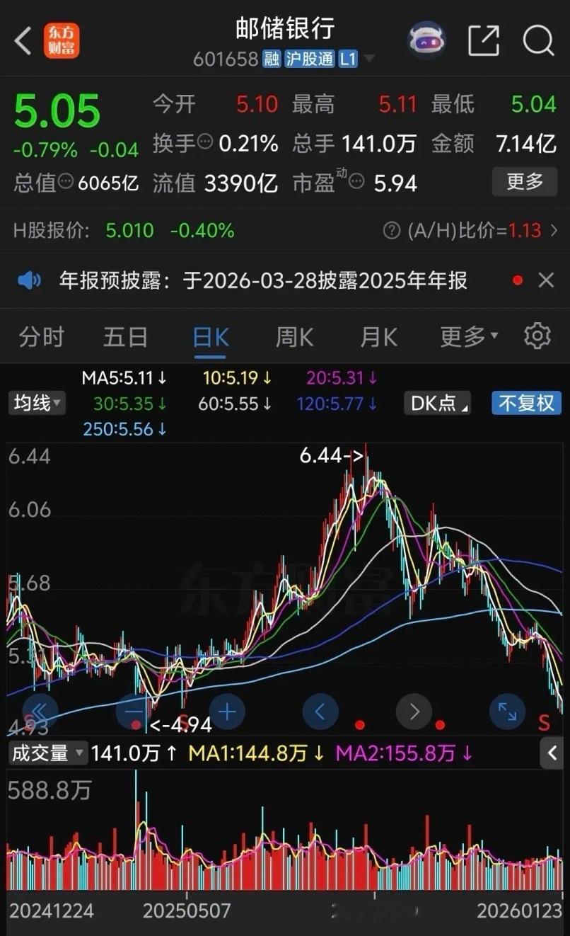 邮储银行跌的太惨了,连续下跌了三周已经逼近5元关口,前半个月本来已经企稳回升,上周三突然一个中阴线改变了运行轨迹,如果是按照正常的走势上周四就会修复上涨,但是偏偏遇到几十年一遇的神奇行情,牛市爆炒题材股甚至亏损股,砸盘打压蓝筹股,而银行股却偏偏成为重点砸盘对象,邮储银行经过这一波又一波的下跌股价已经回到大盘3000点的位置,惨不忍睹,作为国有大行市净率仅仅剩下0.61,股息率也不低有4.3%,远远高于银行存款,长期价值投资者千万不要割肉了。