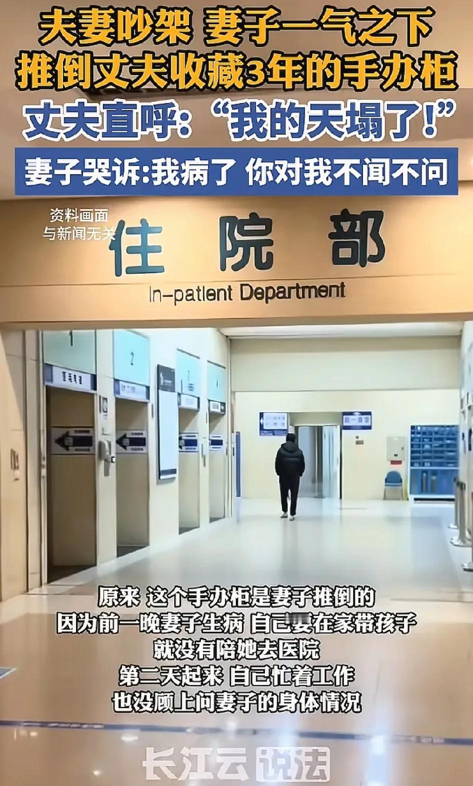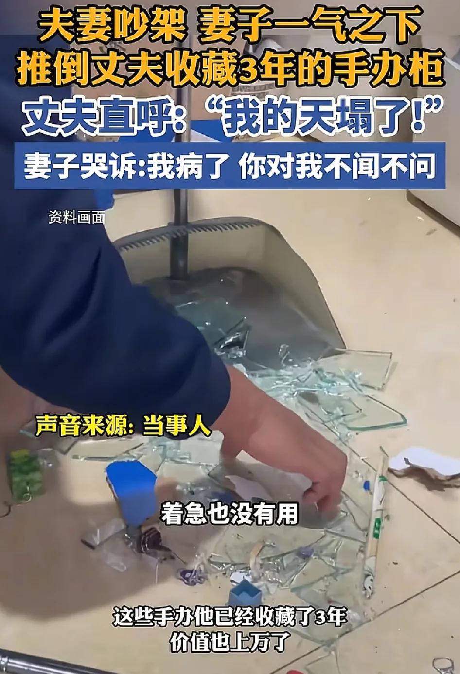 新疆。 丈夫在家照顾感冒的女儿,妻子生病独自去医院,挂水后回家,丈夫正摆弄手办,没关心一句,妻子一怒之下,砸了价值几万块的珍藏,丈夫的心凉了,提出离婚。 老公挺冤,我不抽烟不喝酒,不出轨不赌博,就这一点爱好,唯一的精神寄托,解压方式,你都给我剥夺了,无异于天塌了。妻子更冤,我天天在家洗衣服做饭带孩子,如今病了,你问都不问一句,让手办给你当保姆吧,我不伺候了。 为啥现在年轻人都不愿意结婚了?必须得有经济物质人力保障,否则又没钱还得照顾孩子,只能过成一地鸡毛。