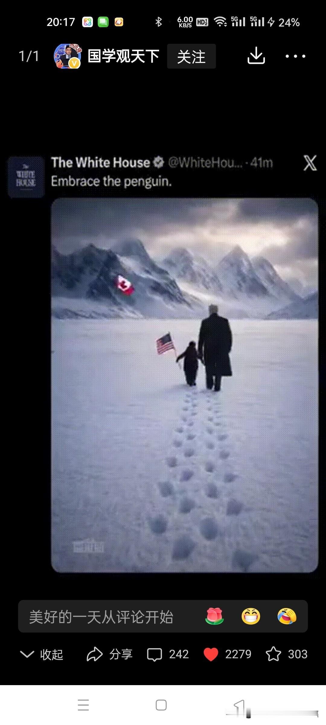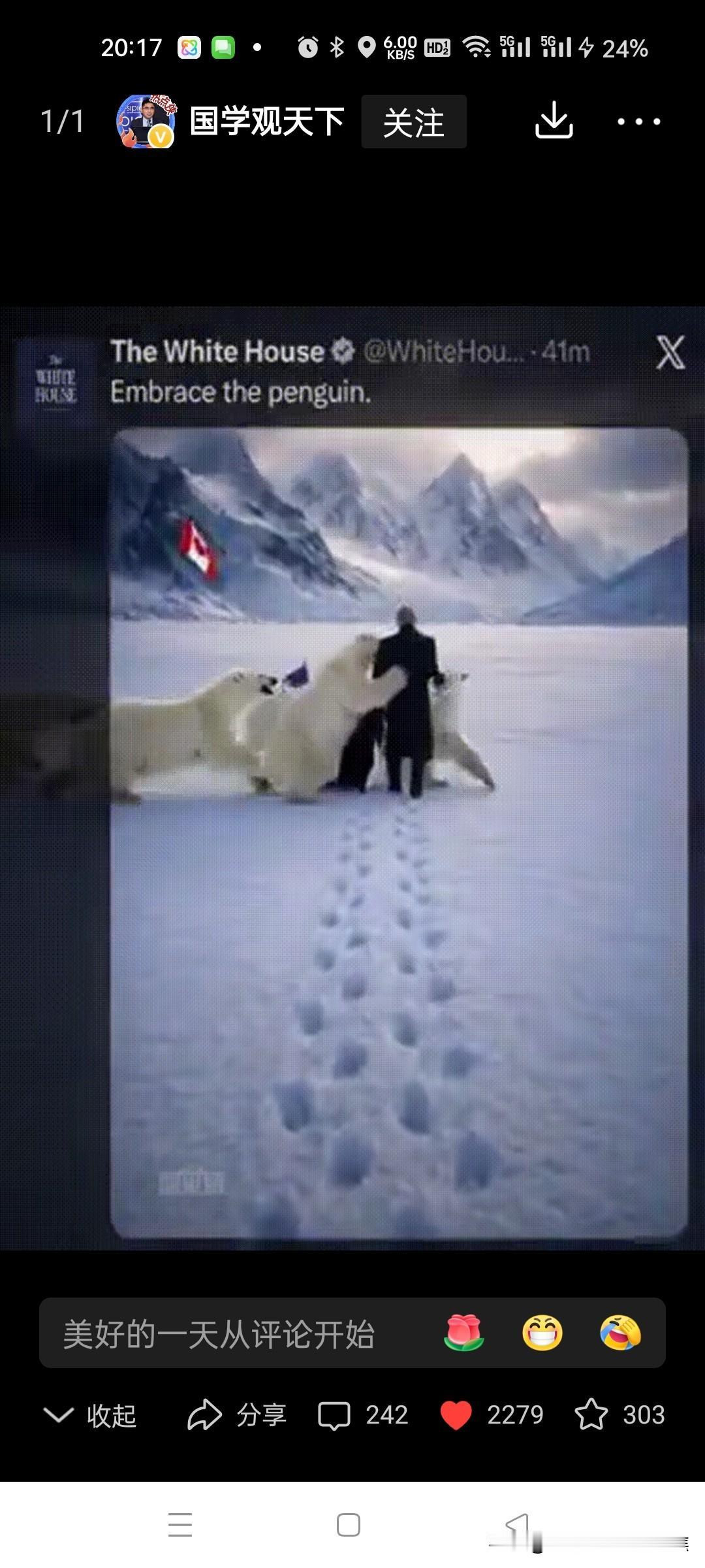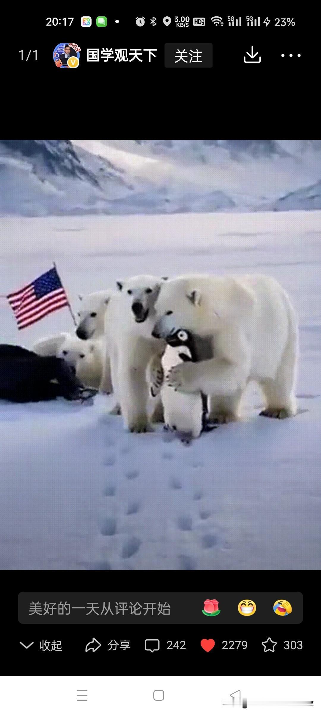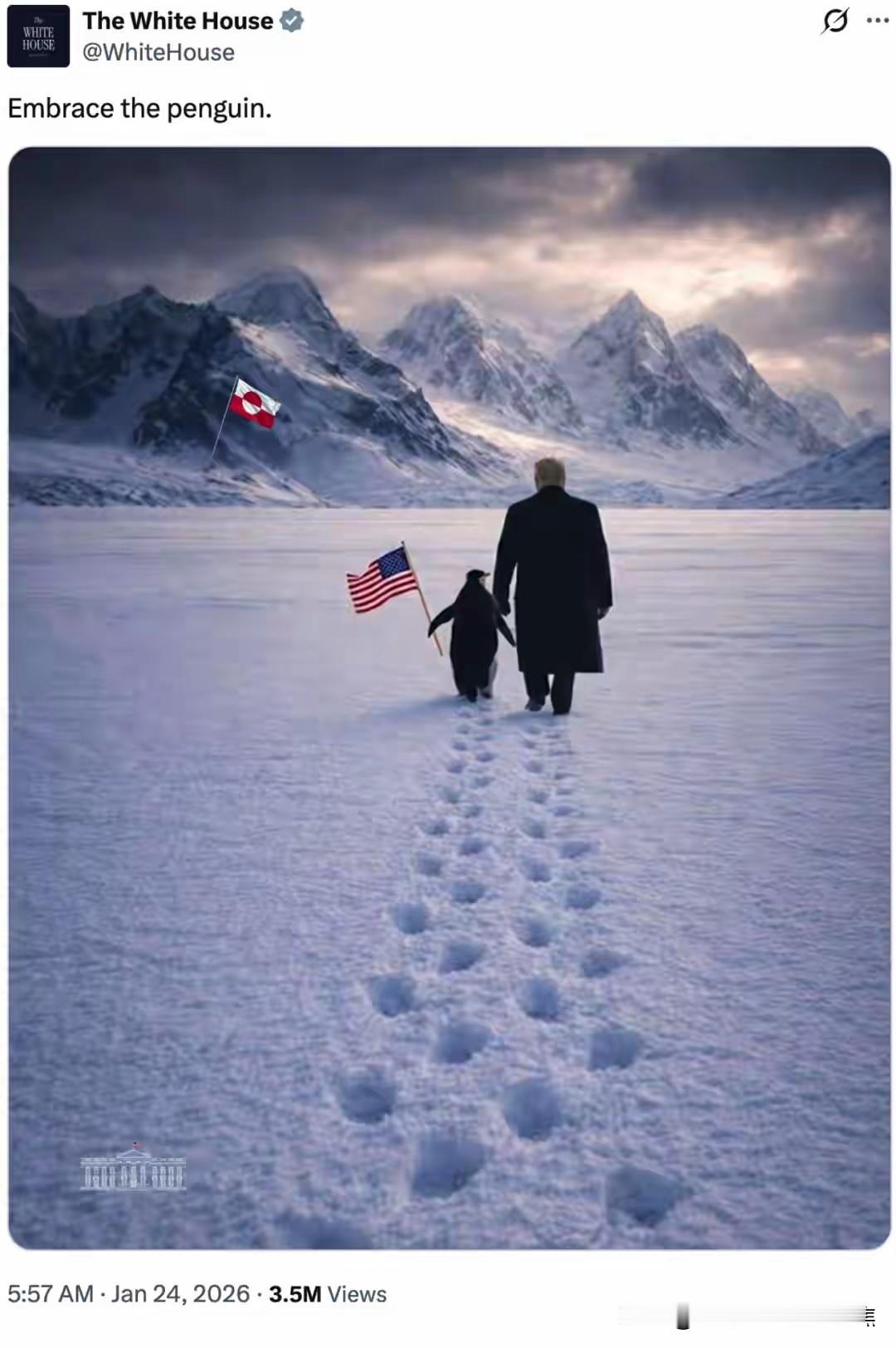 特朗普被四只北极熊扑倒在雪地。凶多吉少。想象特朗普牵引南极企鹅到格陵兰,结果被北极熊扑倒,这画面简直太有戏剧性了。先不说这现实中根本不可能发生,就这场景都能拍成一部搞笑大片了。这脑洞开得够大啊! 说北极熊对企鹅友好,还联想到《我的祖国》那经典歌词,这波创意属实厉害。不过北极熊要是真有这“智慧”,那可真是成精了。而特朗普嘛,在这想象剧情里那是凶多吉少咯。也不知道他要是真遇到这场面,会是吓得目瞪口呆,还是能想出啥办法脱身呢,哈哈。 欧洲对特朗普 特朗普碰壁 极地北极熊 冰岛北极熊 特朗普登机 东北北极熊 特朗普访英国