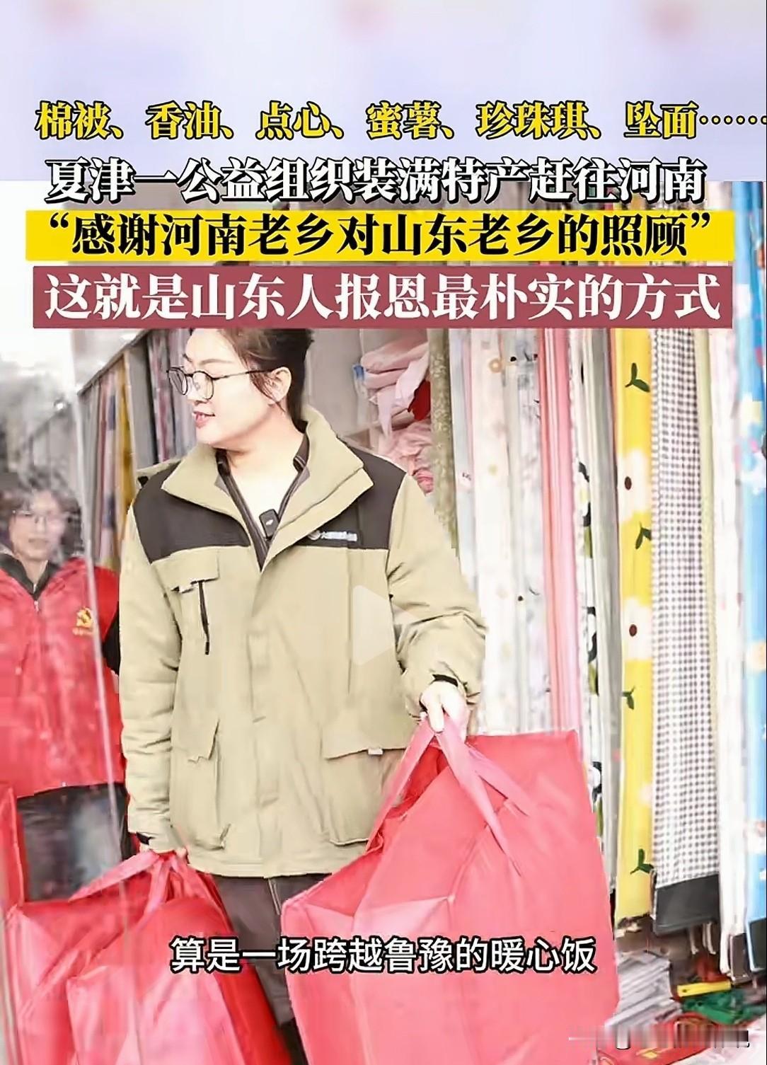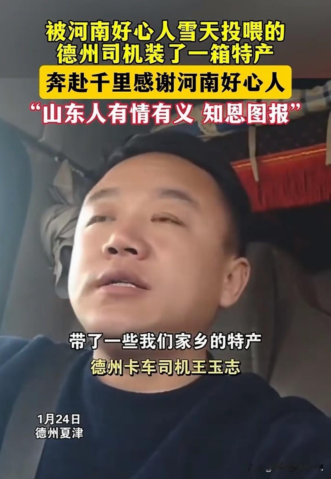 鲁豫一家亲,暖哭了!河南南阳,一山东货车司机遇大雪被困,饥寒交迫,车上只剩方便面,连热水都没有,突然两位陌生大姐敲响了他的车门,邀请他到家里吃饭,当那一碗热气腾腾的羊肉面端上来,司机瞬间泪目,他将这一幕分享到网上,感动了无数网友。事后,司机携带山东特产,回河南致谢,传递鲁豫一家亲的情谊。司机:河南人真中,俺山东人也有情有义,知恩图报! 1月19日,大货车司机小飞哥从河南南召县,装了满满一车货返回德州。 当车子开到皇后乡时,遭遇了大雪封路。 当时车辆正在上坡,可就是一个劲儿的打滑,根本无法前行。 为了安全,无奈之下,小飞哥只好将车停在路边,做好防护后,天已经黑了。 可这条路究竟啥时候能通车,还是个未知,他看着车上仅有的几袋方便面发了愁。 车窗外白雪飘飘,突然有人敲响了车门,车旁站了三位当地村民。 姐妹三人,发现小飞哥的车滞留在路旁,马上邀请他到自己家里吃晚饭。 开始小飞哥还有些顾虑,出门在外,和人家无亲无故的,怎好意思去打扰? 可王京三姐妹们,不断的劝说小飞哥,让他不要有顾虑。 大姐说自己家也有开大货车的,知道他们出门在外不容易。 最终,小飞哥放下顾虑,跟着大姐去了家中。 王京三大姐那碗冒着热气,香喷喷的羊肉面端到小飞哥跟前时,这位山东汉子瞬间泪流满面。 常年出门在外,吃饭总是冷一口热一口,难得受到如此待遇,小飞哥的眼泪砸进了那碗面里。 晚上回到车里,小飞哥感激的同时,觉得无以回报,他想着,怎样帮好心的大姐做点什么。 第二天一大早,他拿上铁铲来到王大姐家门前,悄悄的铲起了雪,连邻居的门前都清理的干干净净。 雪还在飘,车依然停在路边无法动弹。 王大姐每天为小飞哥准备好热饭菜,生怕他吃不上饭。 周边的村民看到小飞哥的车一直停在那里,知道他遇到了困难。 期间不断有村民上前询问他需要什么帮助。 他去村里的超市买东西,老板免费给他提供热水,还送给他菜。 环卫工替他在车前撒盐融雪,虽然风雪寒冷,小飞哥的心被一次次暖哭。 在这寒冷的异地他乡,一个山东汉子,在遇到困难时,却得到了这么多陌生人的无私帮助。 当地一家企业得知小飞哥的事情后,将面条、包子送到王京三大姐家。 这个冬天,善意在默默的传递,没人图什么。 小飞哥通过自己的社交账号,分享了自己遇到的这些暖心事。 他的媳妇也被感动,她给王大姐打电话,表达了自己的感激,你们那儿的人太好了,河南人真中! 视频很快在网上火了,引发无数人的点赞。 视频感动了无数人,人们纷纷留言表达自己的感想。 山东河南一家亲,这是跨越鲁豫两地的友情! 善意是相通的,鲁豫两地的相亲,都在不自觉间彼此奉献过这份热情。 前不久,山东日照的芦阿姨,连续9天,给在她家附近施工的河南民工送饭,就曾感动过鲁豫两地,双向奔赴的佳话不断呈现。 路上的雪化了。小飞哥要回山东,车上被王大姐和乡亲们放了牛奶、面条、包子。 乡亲们说着最诚实的话:不能让他空手回家。 这些食品小飞哥路上没舍得吃,而是送到了村里的爱心食堂。 他要把河南老表的这份温暖,传递到山东家乡。 1月24日,小飞哥平安返回德州老家。 卸完了车上的货,稍作休息后,小飞哥难忘河南的大姐,和陌生的乡亲们。 他和家人准备了山东特产,要把这份感动全网的温暖传递下去。 他要专程去曾给予过他温暖的河南致谢。 德州扒鸡是珍贵的礼品必须是要带上的,还有石磨香油,更不能少了当地的糕点、果酒、珍珠琪已经全部准备好了。 小飞哥代表家乡人,要把心里最好的东西恨不得都带上,让河南的乡亲,感受到孔孟之乡、齐鲁大地的深情厚意。 河南人真中!咱山东人有情有义,知恩图报 !道出两地乡亲的心意。 一辆载有山东特产的车,一个有情有义的德州货车司机,将鲁豫两地相连。 一句河南山东一家亲,再次让人泪目! 目前,小飞哥已启程前往河南,致谢那些帮助过他的热心乡亲。 然而事情并没有就此过去,小飞哥的家乡,山东德州夏津的志愿者,也准备了满满一车当地的土特产。 也正准备启程前往河南走亲戚,让河南的乡亲们,尝尝他们家乡的好东西。 他们想着把这一场跨越鲁豫两地的友情之路,一直走下去。 有河南网友看到视频后称:山东人太讲究了,真没必要这样。 山河四省,同气连枝,如我的家人到山东,希望你们能帮我照顾他们。 你的家人到河南,我们也会尽最大的努力照顾他们,爱是相互的! 山东网友称:再次见证了山河四省一家亲!河南人民给温暖,我们山东人也不差事! 有河南网友哭了:河南人感谢山东在7.20雨灾中的无私救援,见到最多的就是鲁牌车辆,感谢你们! 真的被暖哭了!河南有礼,山东有恩,这份恩情温暖了中原大地。 冰雪会化,路途还长,但那些寒冬里的善意会永远传递。 关注@赵哥的法律观