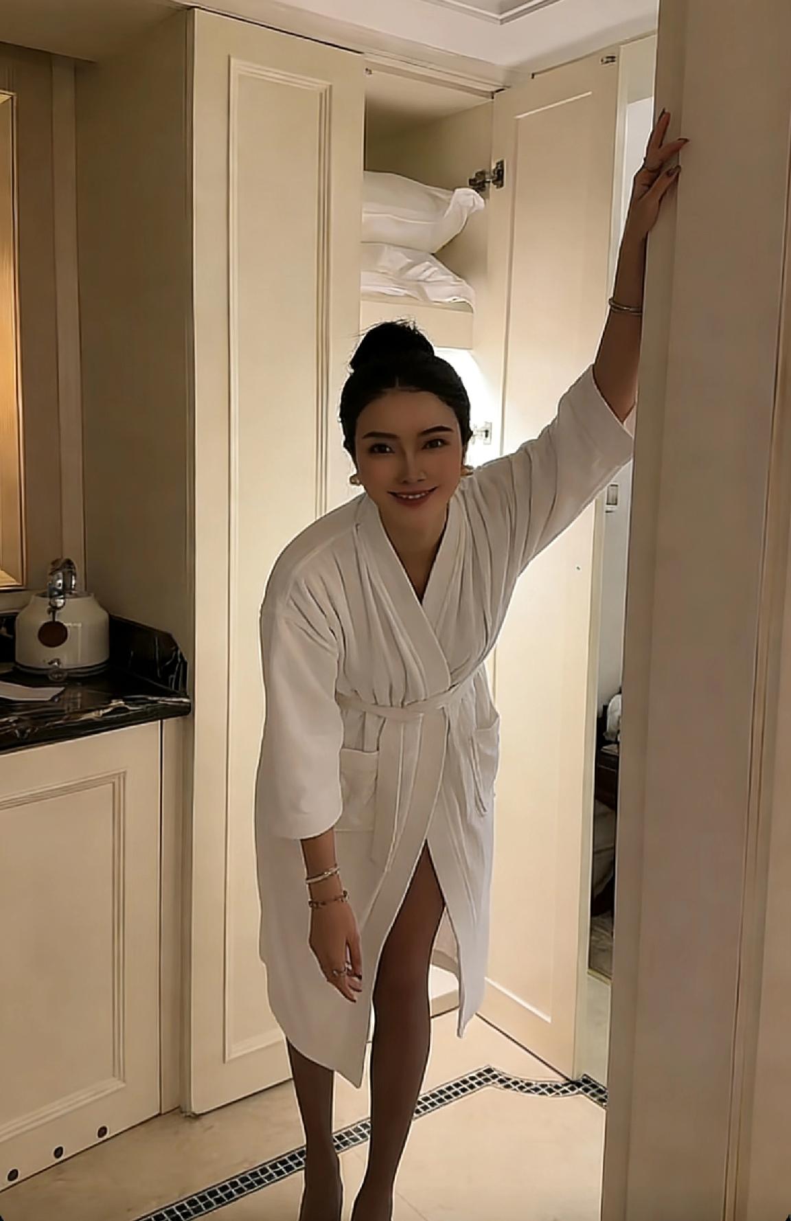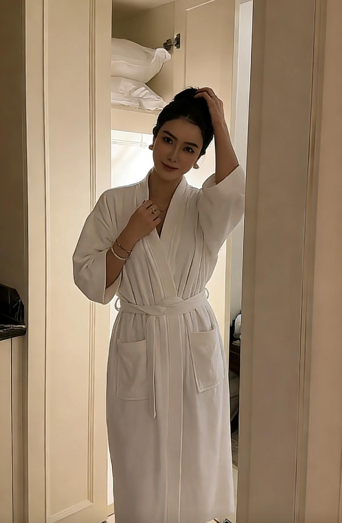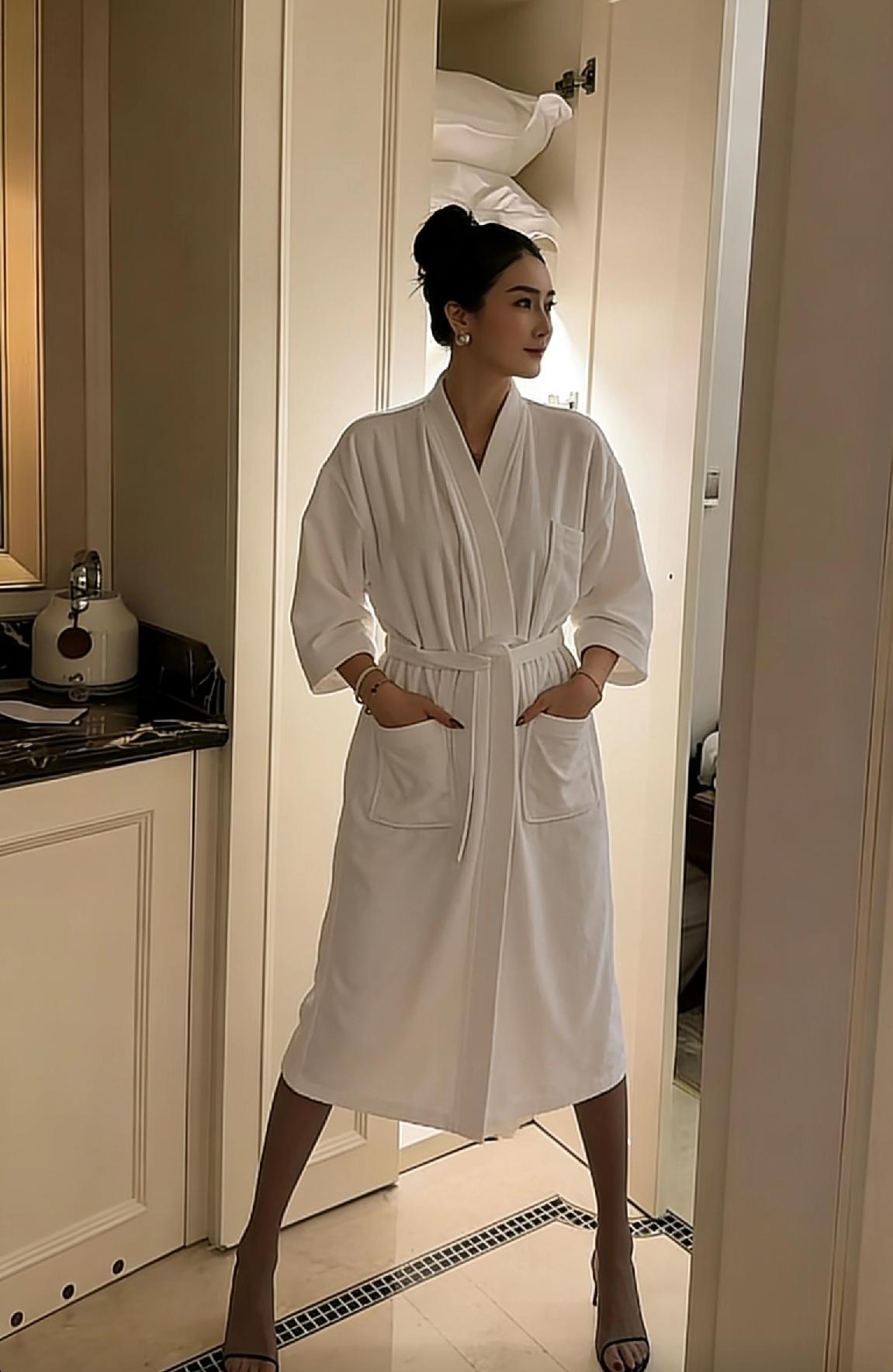穿上白色浴袍,享受精致生活。