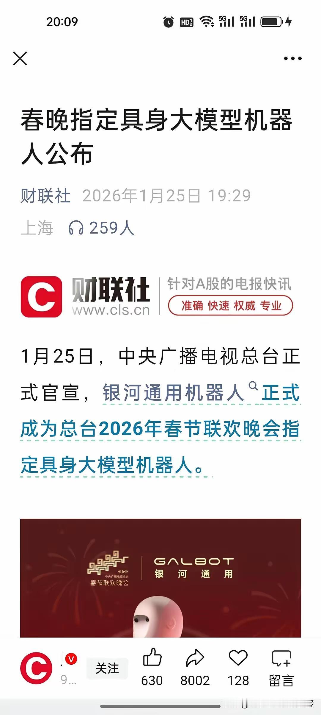 今年的春晚又上机器人表演节目了,去年是宇树机器人表演耍手绢,让机器人火了一把,今年的春节确定是银河通用机器人,不知道表演什么节目,不知道今年还能不能带火机器人的股票了,我感觉应该是不能像去年那么火爆,如果是机器人股票近期大涨反而是卖出。