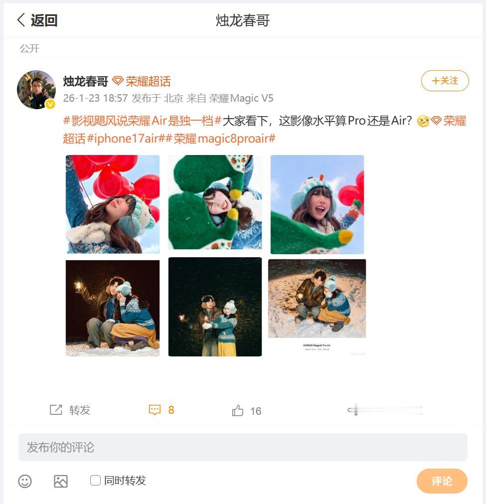 如何让小伙伴们拍摄冬日氛围感照片,大家会如何选择题材呢?刚刚看到荣耀俱乐部负责人烛龙春哥,分享的一组荣耀Magic8 Pro Air拍摄的人像写真和冬日氛围照片,尤其是采用长曝光1/25s拍摄,将飘落的雪花拉成细密的光轨,我蛮喜欢的 畅聊数码新品 数码资讯