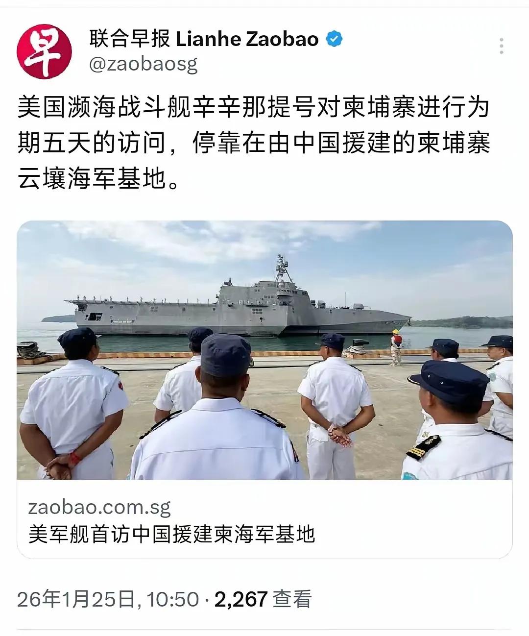 一个小国在中美之间之间搞平衡,请不要出卖中国的利益。 中国援建的柬埔寨海军基地,你让美国军舰首访,也真是有点不地道,看来柬埔寨被美国的威慑和大棒吓怕了。特别是洪森的儿子当了首相后。 请柬埔寨不要在中美之间选边站,当美g,不要当在草地上的两个大象之间的🌿小草。 请你柬埔寨好自为之。