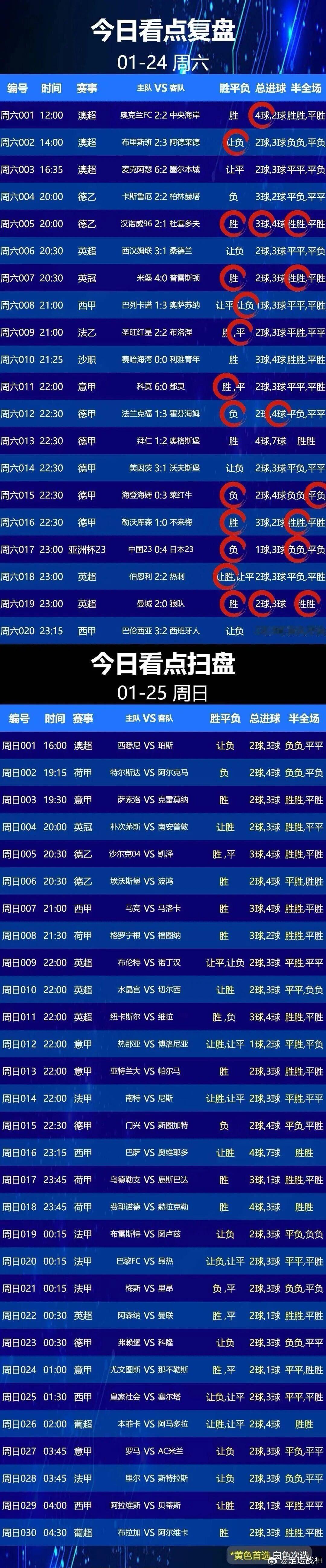 1月25日001 西悉尼流浪者 VS 珀斯光荣 002 特尔斯达 VS 阿尔克马尔003 萨素洛 VS 克雷莫纳004 朴茨茅斯 VS 南安普顿005 沙尔克04 vs 凯泽斯劳滕006 埃弗斯堡 VS 波鸿