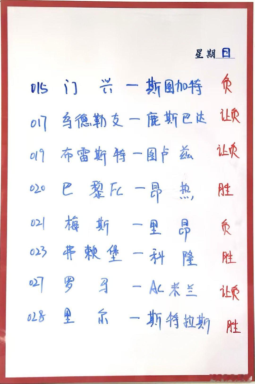1月25日007 马竞 VS 马洛卡008 格罗宁根 VS 福图纳009 布伦特福德 VS 诺丁汉森林010 水晶宫 VS 切尔西 011 纽卡斯尔联VS 阿斯顿维拉012 热那亚 VS 博洛尼亚013 亚特兰大 VS 帕尔马014 南特 VS 尼斯015 门兴格拉德巴赫VS 斯图加特016 巴塞罗那 VS 皇家奥维耶多017 乌德勒支 VS 鹿特丹斯巴达018 费耶诺德 VS 赫拉克勒斯