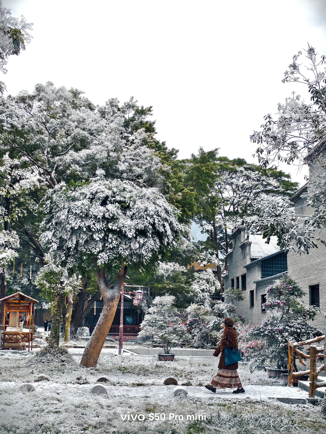 细碎的“雪花”衬着树影、石阶亭台楼阁