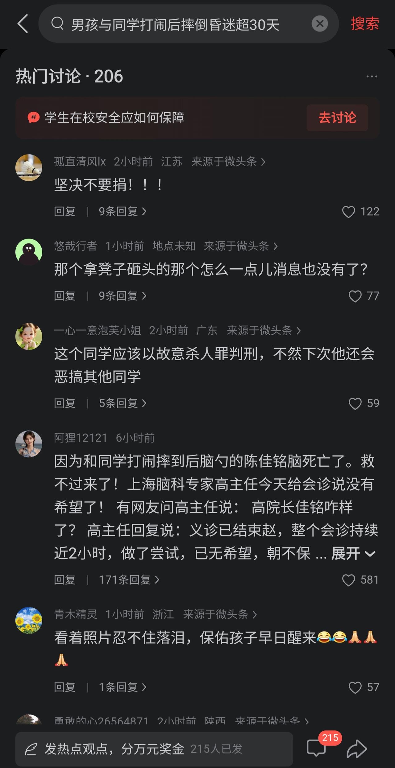 看完之后心情还是比较沉重,就我个人来说,因为职业关系也看到很多家庭的悲欢离合,只有祝愿孩子能够产生奇迹,早日康复。 在这个事情上尤其佩服孩子的父亲,现代社会一旦出现有事情了如果没有一个有责任、该负责、需赔偿的主体反而觉得奇怪了。 前几天还有一个新闻,在路上骑自行车的时候碰到树了,要起诉政府没有及时修剪树枝。走在路上摔倒了要起诉市政没有及时清理路面。在超市摔倒了要告商场。几个人一块喝酒最后出事了要起诉同饮者。 就给我了这么一个印象,似乎任何一个人意外受到伤害,在外肯定有一个需要赔偿自己的主体存在,否则自己就吃亏了。殊不知这样的情况自己可能确实得到了一些赔偿,但是对社会风气的破坏是难以估量的。 这则新闻孩子爸爸说出的话真的让人感到一种震耳欲聋的感觉。没有埋怨一块打闹的孩子,主动说孩子在之前已经有了一段时间的感冒。没有提出赔偿诉求,只是希望孩子能够尽快好起来。 相信好人好报,愿孩子早日康复。