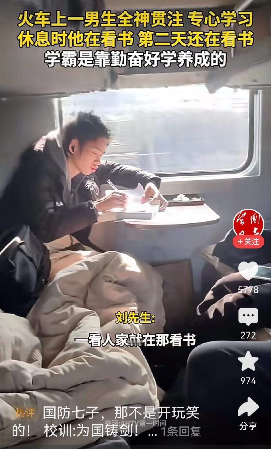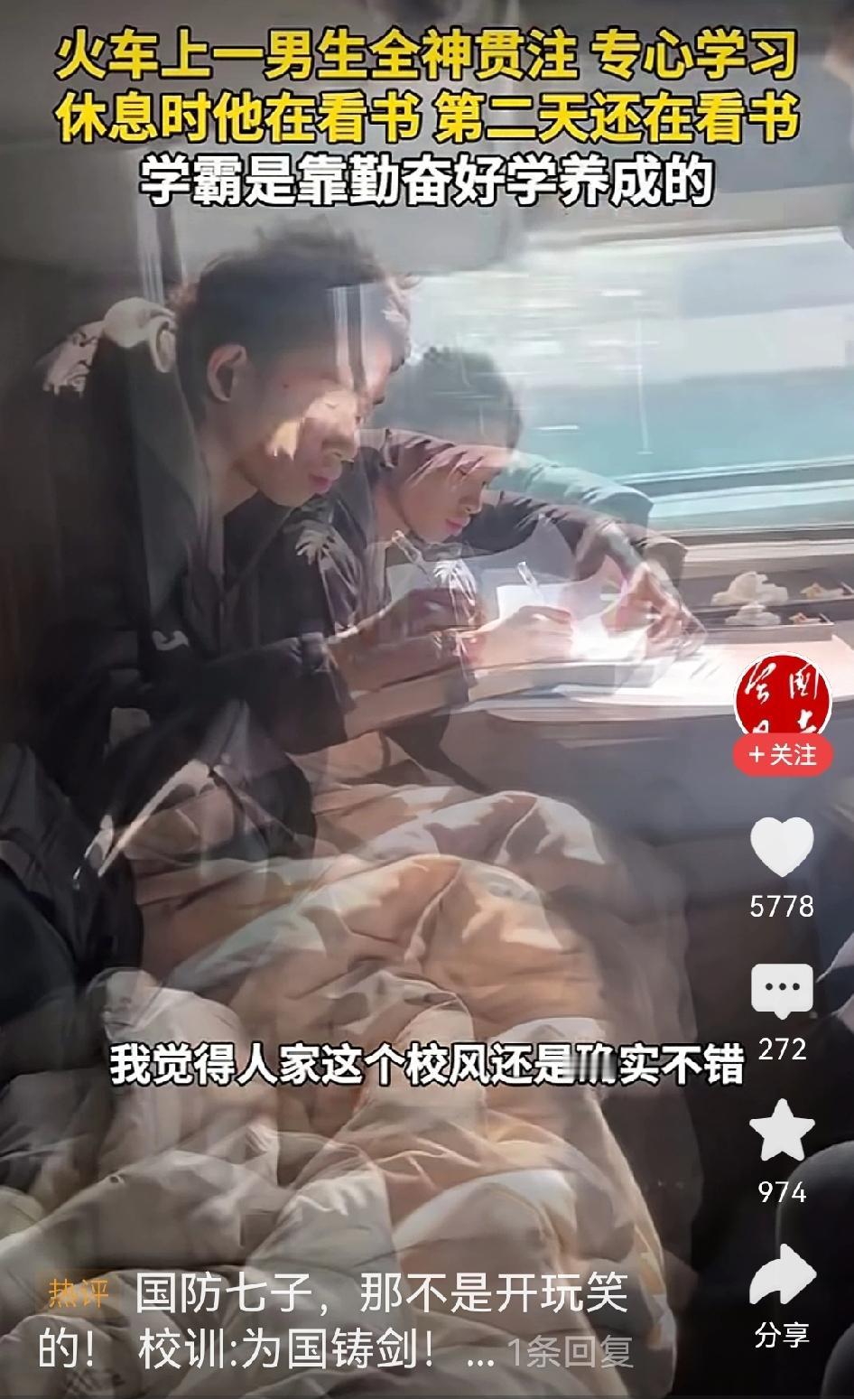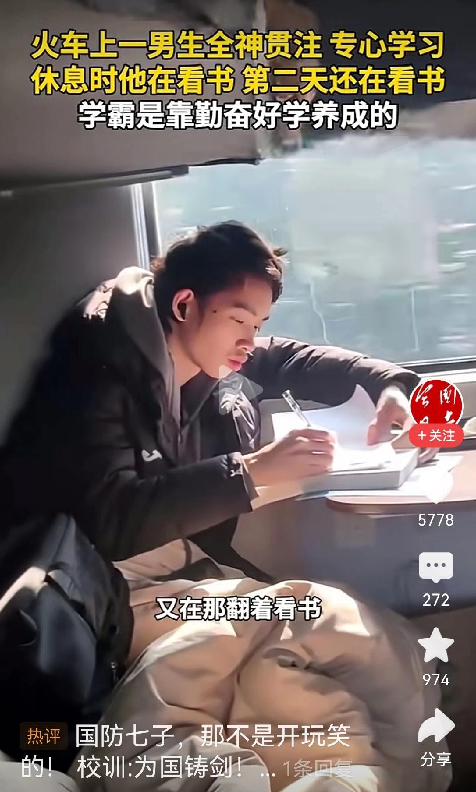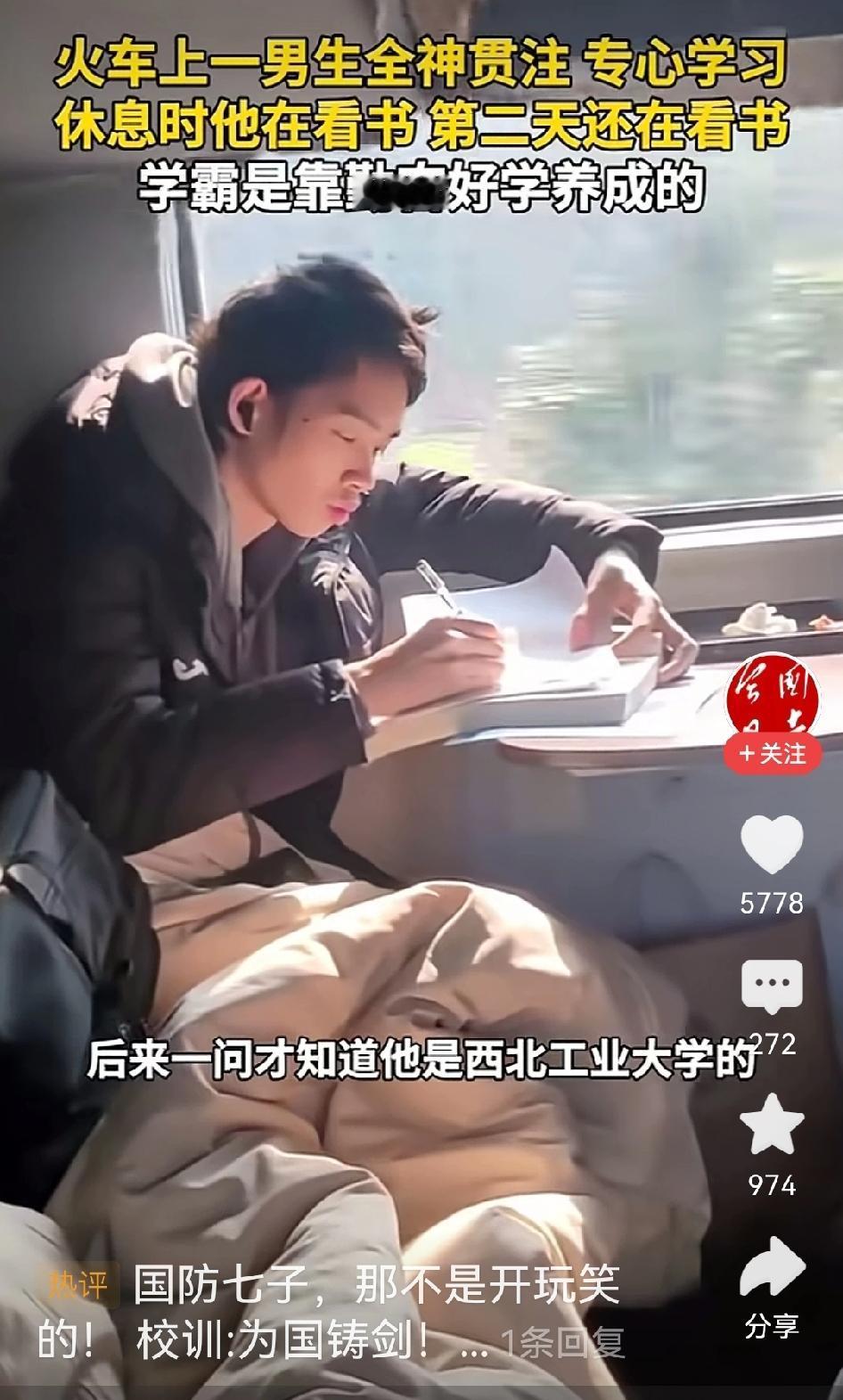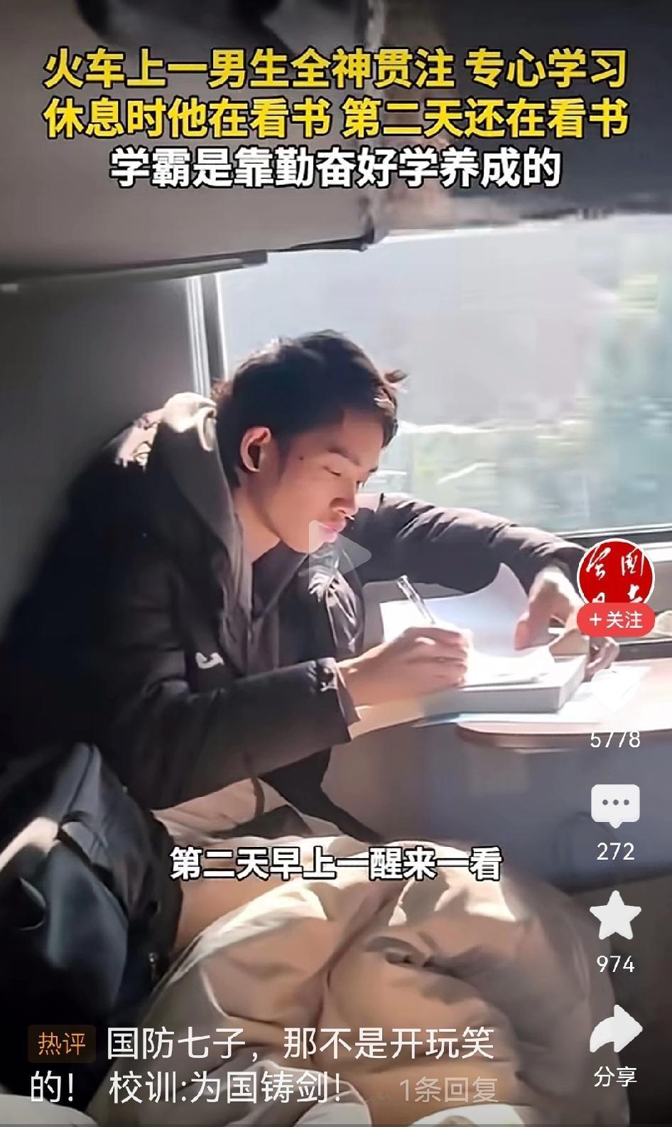 请问,你有过一天里除了吃饭睡觉其他时间都是在学习吗?如果没有,为什么要给出这样的评论?一网友火车上拍下这段视频,从上火车这位大学生在学习,第二天醒来一睁眼他还在学习。于是网友问他,得知是西北工业大学的。网友感叹,有因就有果,这么努力怪不得人家能考上顶尖大学。 可网友评论:“普通人通过努力只能考上普通大学,那些顶尖大学只有天赋才可以。”不知道这些网友是怎么张口就来评论的,只是想问一句,曾经的你有没有这样努力过?有没有除了吃饭睡觉,甚至吃饭也都在努力学习过?如果没有这么努力,凭什么就动不动说天赋。连努力都没有努力过,张口闭口就说天赋决定,不觉得可笑吗?工作也是,工作都未曾全心全意的努力过,首先想的就是得失,事情还没做,就把各种结果在脑海里先演算一遍,最后就得出努力也没结果。于是就说别人有天赋,比不了。网友们,不觉得荒唐吗?