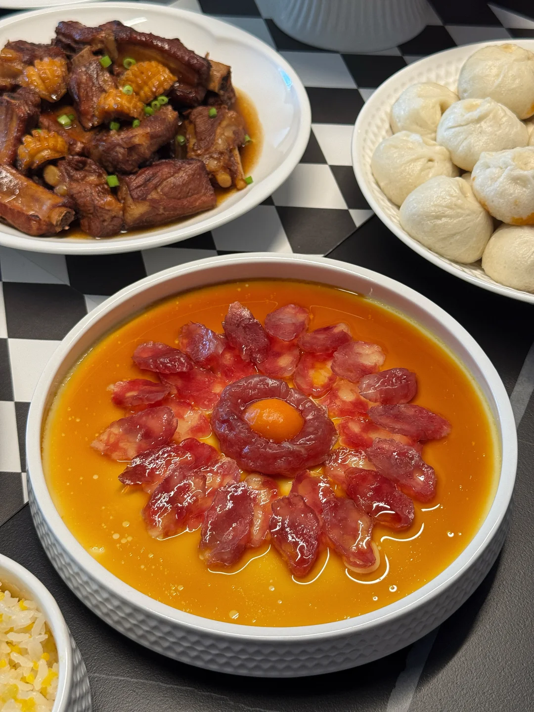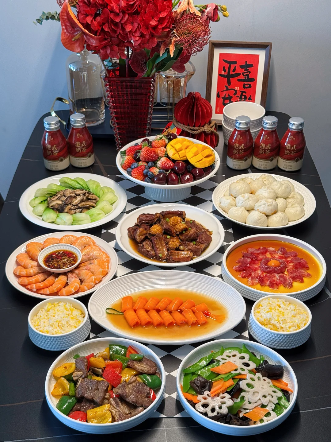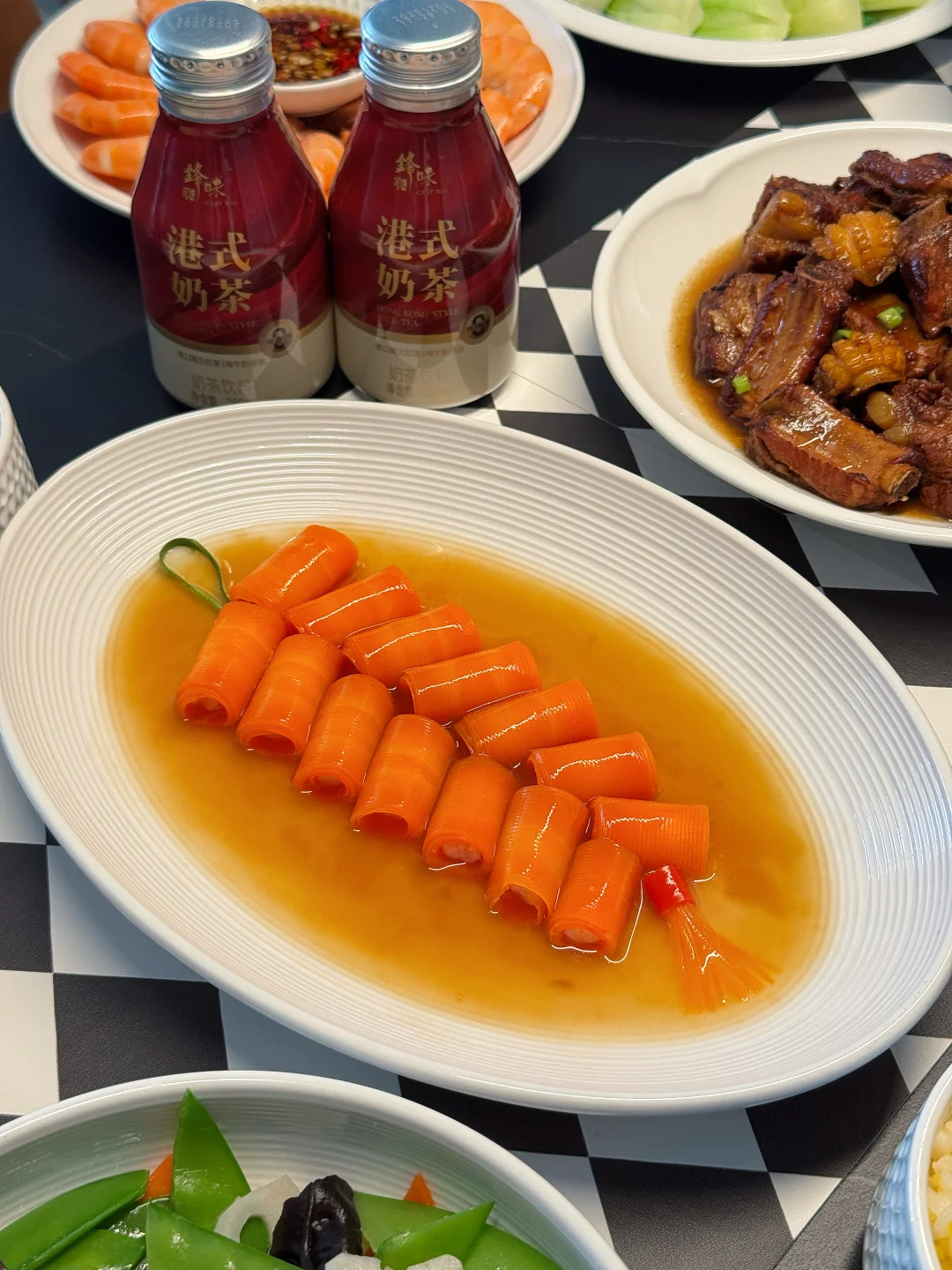 过年的热闹不用到处找,往餐桌旁一坐就懂了——这里,就是年味最足的地方~ 今日家宴菜单: [福R]胡萝卜酿虾滑 [福R]鲍鱼烧排骨 [福R]腊味蒸蛋 [福R]香煎牛仔骨 [福R]荷塘小炒 [福R]白灼虾 [福R]油菜香菇 [福R]主食:小笼包 米饭 [福R]饮品:港味奶茶 最近沉浸在年底备年货的快乐中~每年我家都屯不少的锋味派,从早餐到年夜饭、追剧零食到走亲好礼,一站式搞定全家味蕾~ 今年又囤了腊味礼盒+港式奶茶+小笼包,这红色的礼盒包装,新年的仪式感马上就有了!新年送礼首选这个锋味派丰年腊礼腊味礼盒,里面的原味腊肠、玫瑰露味腊肠、五花腊肉、蛋黄盏都是地道的广式风味,由非遗传承人监制,用原味腊肠和蛋黄盏做了腊味蒸蛋,腊肠肉质紧实不柴,肥而不腻!蛋黄盏肉饼用的定安黑猪肉,里面有大颗的鸭蛋黄,口感绵密,还有原味特级腊肠,经典地道,五花腊肉肥瘦比调和的很好,一拿回家就被抢光了!独立包装食用起来也方便,年夜饭切一盘做腊味拼盘,红红火火超应景,走亲访友拎一盒,既有心意又有面子~ 奶茶控怎么能错过这款港式奶茶礼盒呢~来自斯里兰卡锡兰红茶的自然茶香,搭配纯牛奶与新西兰乳粉,入口醇厚 奶味丝滑和在奶茶店喝的港味奶茶一样美味!新年限定礼盒年味拉满!不管是屯在家里待客还是送礼都合话! 锋味派的小笼包是我家一年四季常备的,配料表干净,内馅用的黑猪肉,肉粒饱满 鲜嫩多汁,而且食用也方便,无需解冻直接上锅蒸8-10分钟就能吃,趁着过年休息我又多备了几袋,就算是过年睡懒觉也能吃上热乎早餐啦~