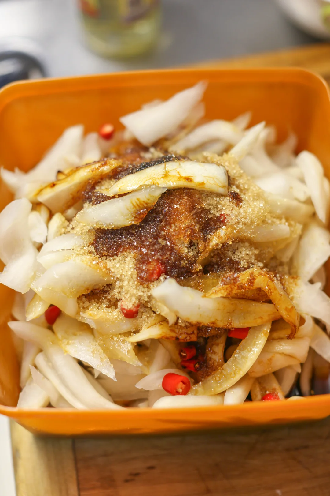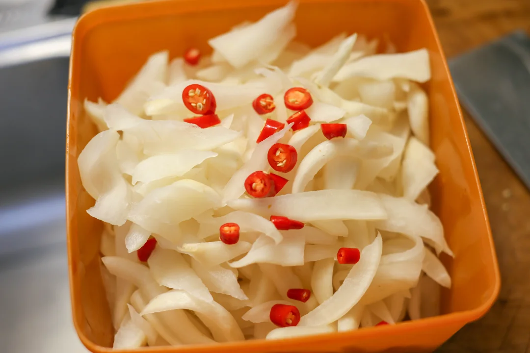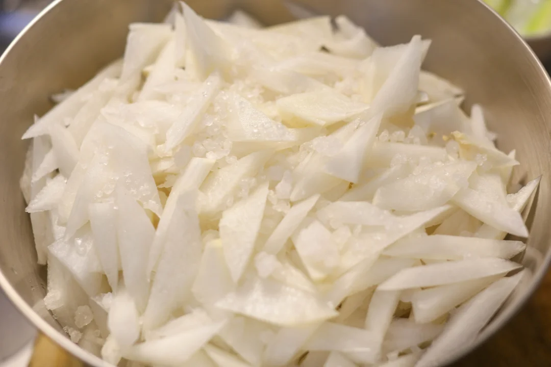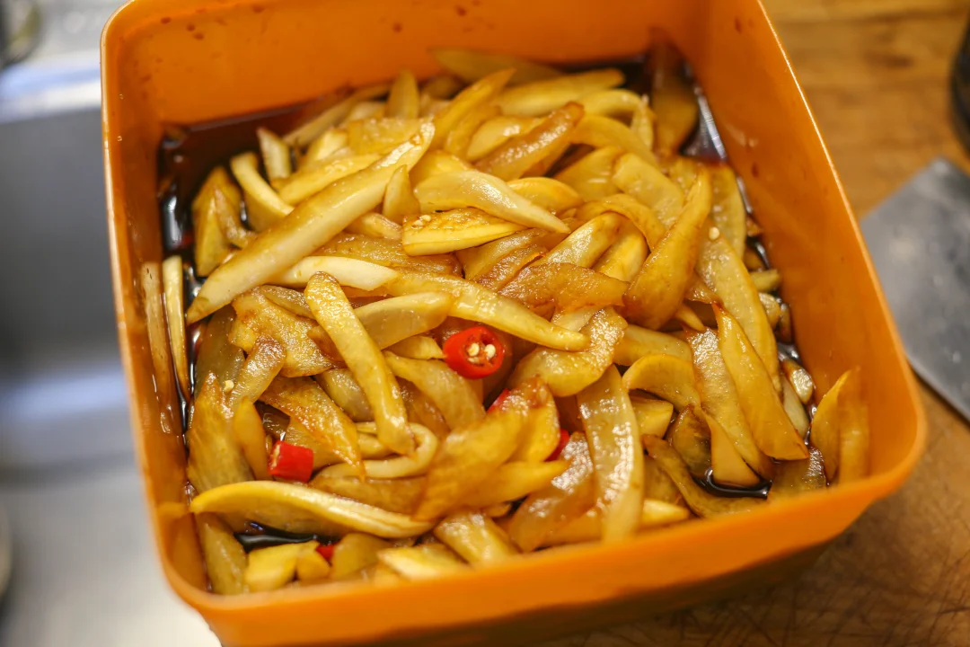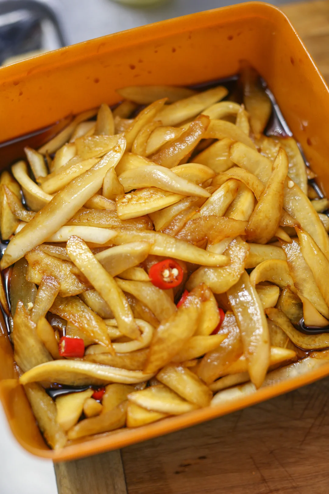 白萝卜三根,1切2,2切4,把中间的芯用到切走,萝卜皮和萝卜芯斜到切长片,100克粗盐,杀出水分,有足够的底味,腌制一个小时。 家里的常规炒勺为准: 2勺味极鲜酱油 2勺白醋 半勺老抽 1勺白糖 适量小米辣 腌制好的萝卜长条控干水分,倒入以上料汁拌匀,腌制6个小时以上,冰箱冷藏保存。 红润通透,不管是喝稀饭、吃面条都是非常好的下饭小凉菜,脆爽开胃。